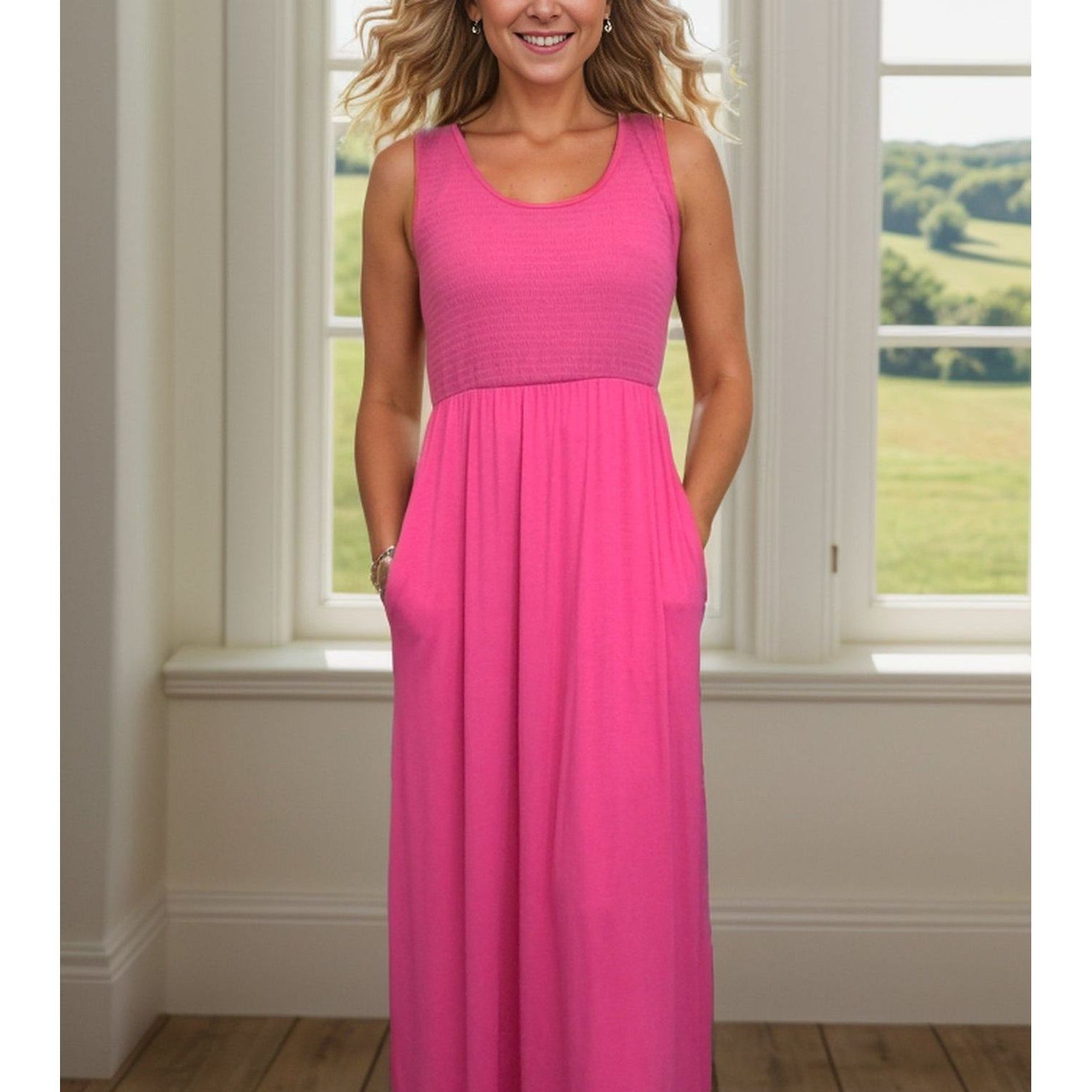 The Begonia Beauty Maxi Dress is your go-to for effortless style. With a sleeveless design, soft jersey knit, and a flattering scoop neck, you'll stay cool and comfortable all day long. Plus, the side pockets and empire waist add practicality and flair.