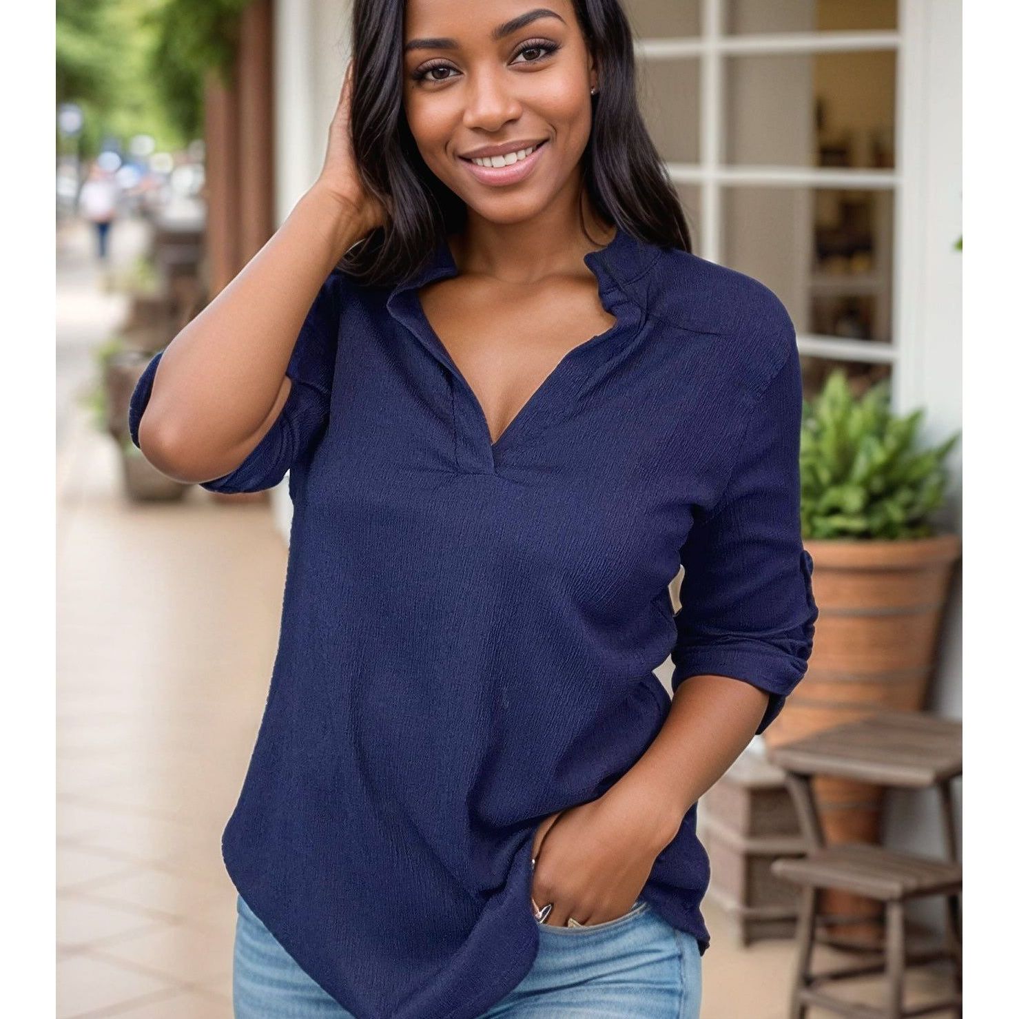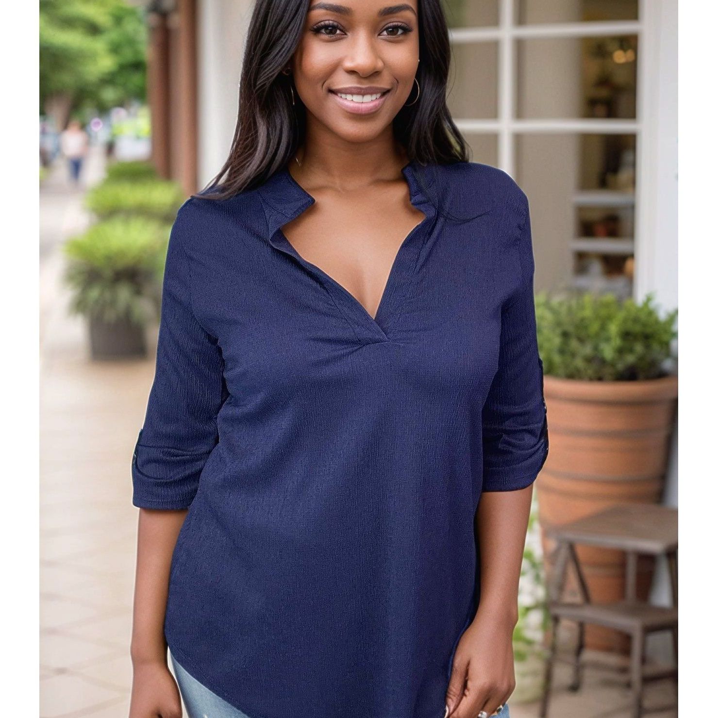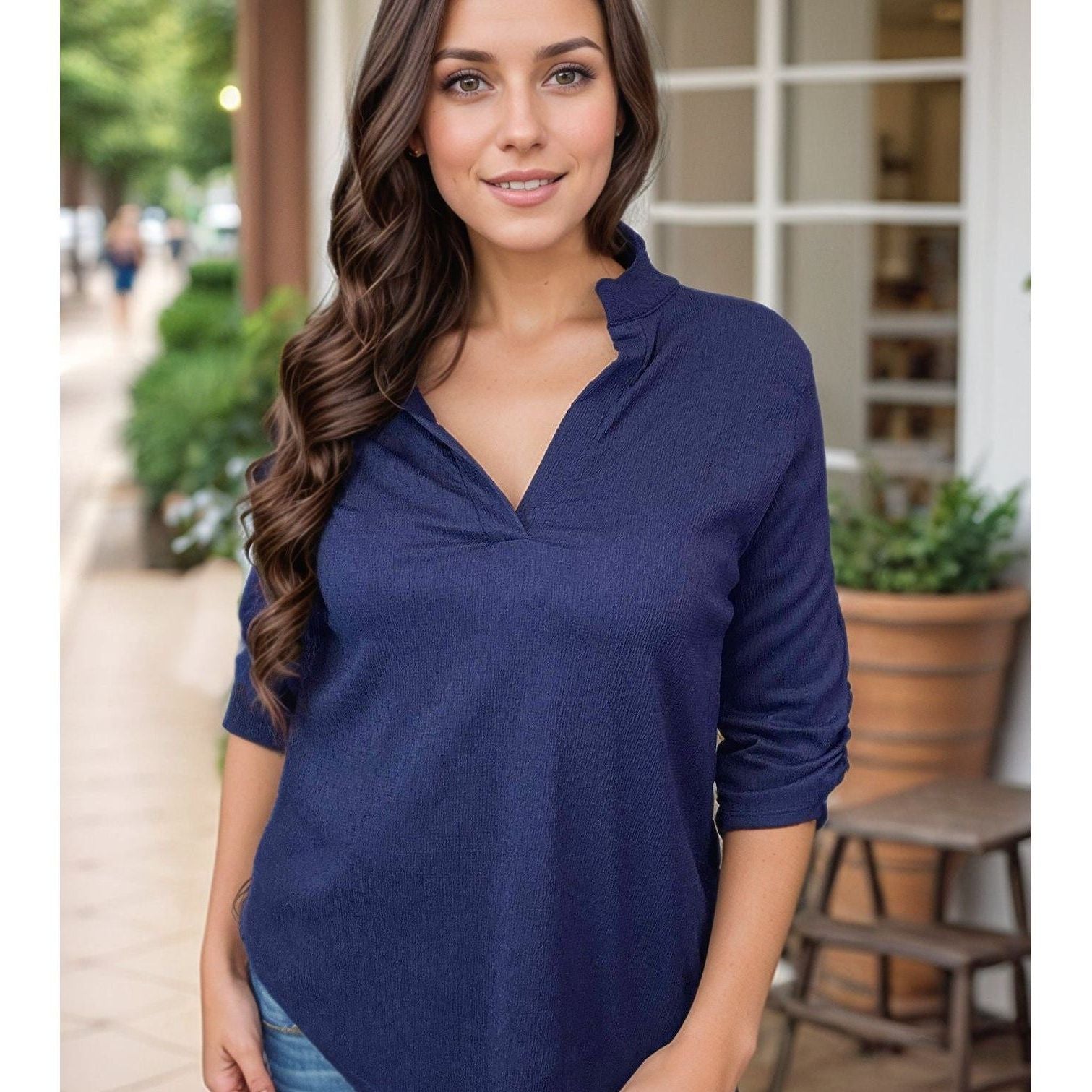 Get ready to rock this Gabby top from Blueberry Hill! With a v-neck and three quarter sleeves, this textured top features a bold mandarin collar and shiny gold button details. Stand out from the crowd in style and comfort!