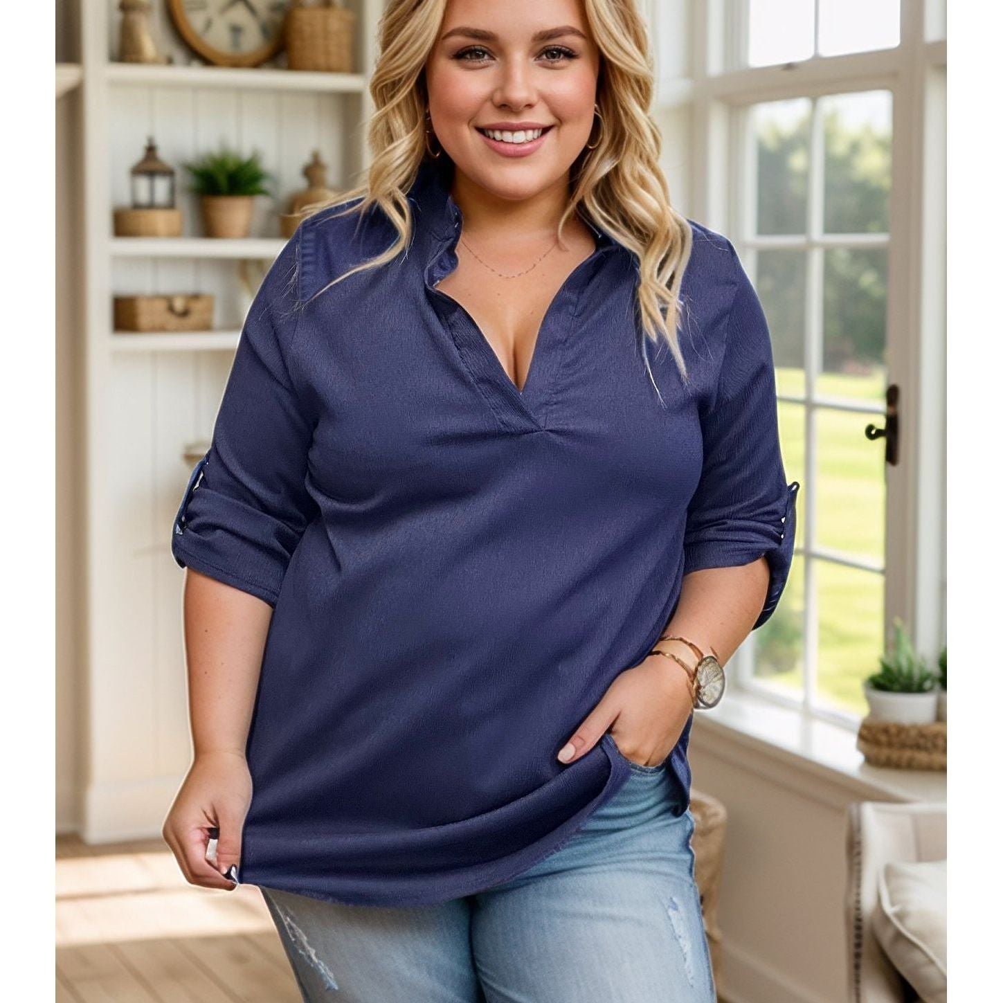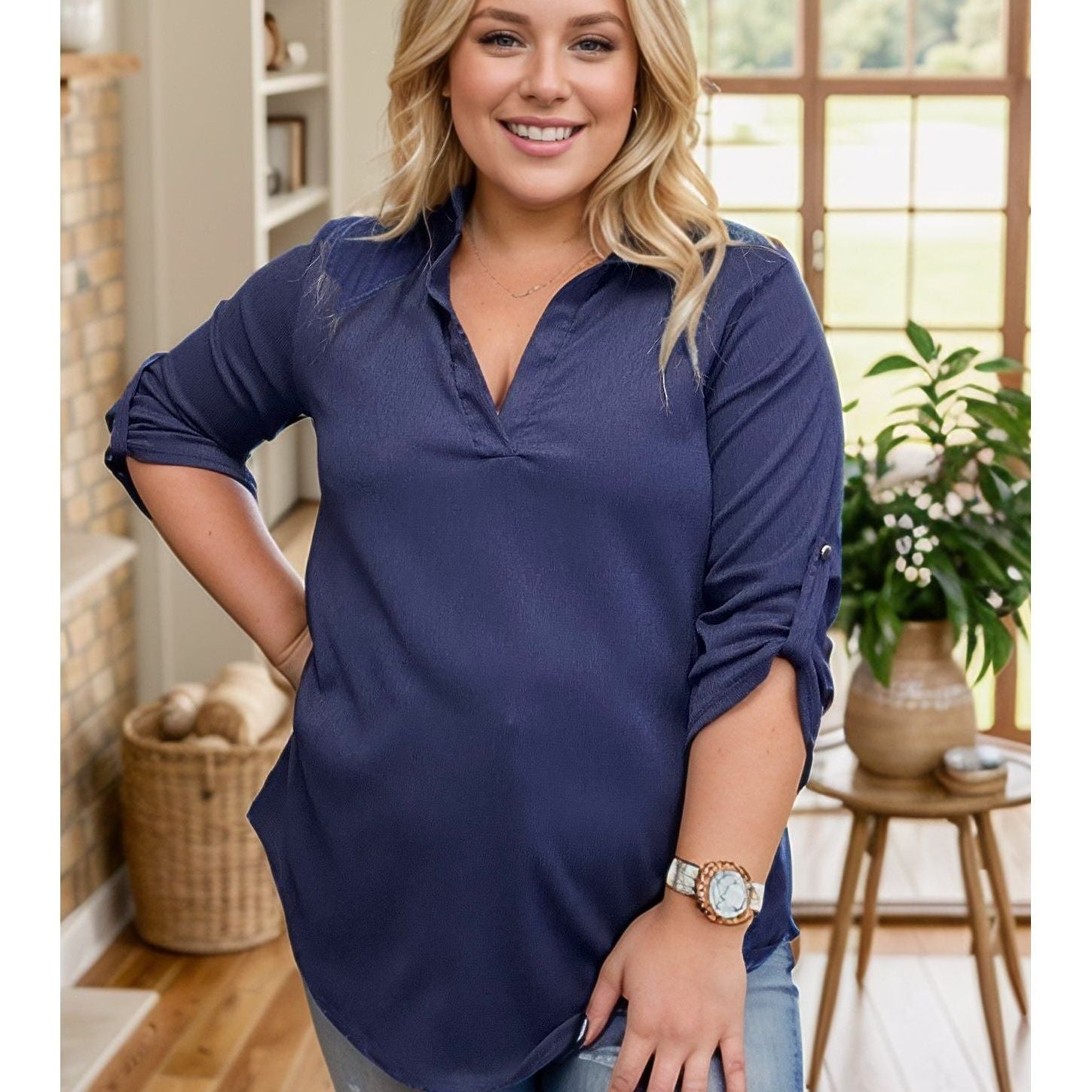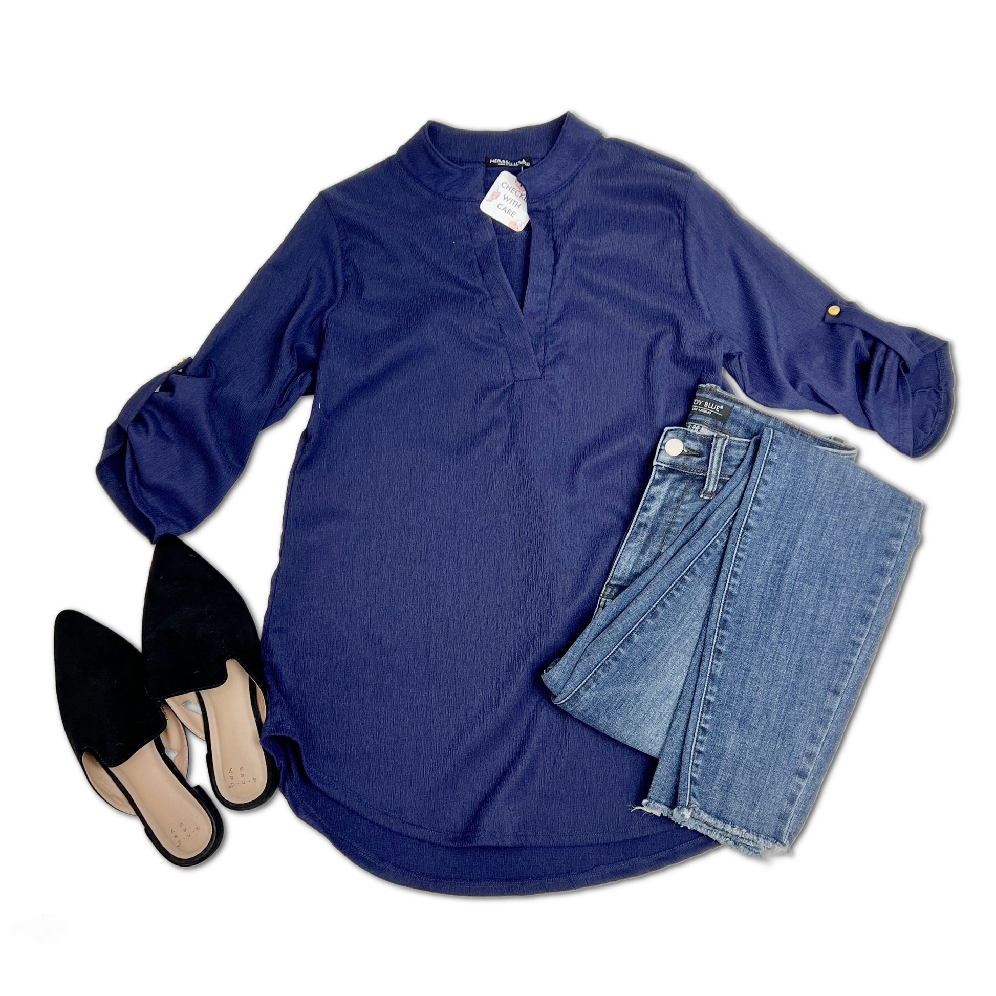 Get ready to rock this Gabby top from Blueberry Hill! With a v-neck and three quarter sleeves, this textured top features a bold mandarin collar and shiny gold button details. Stand out from the crowd in style and comfort!