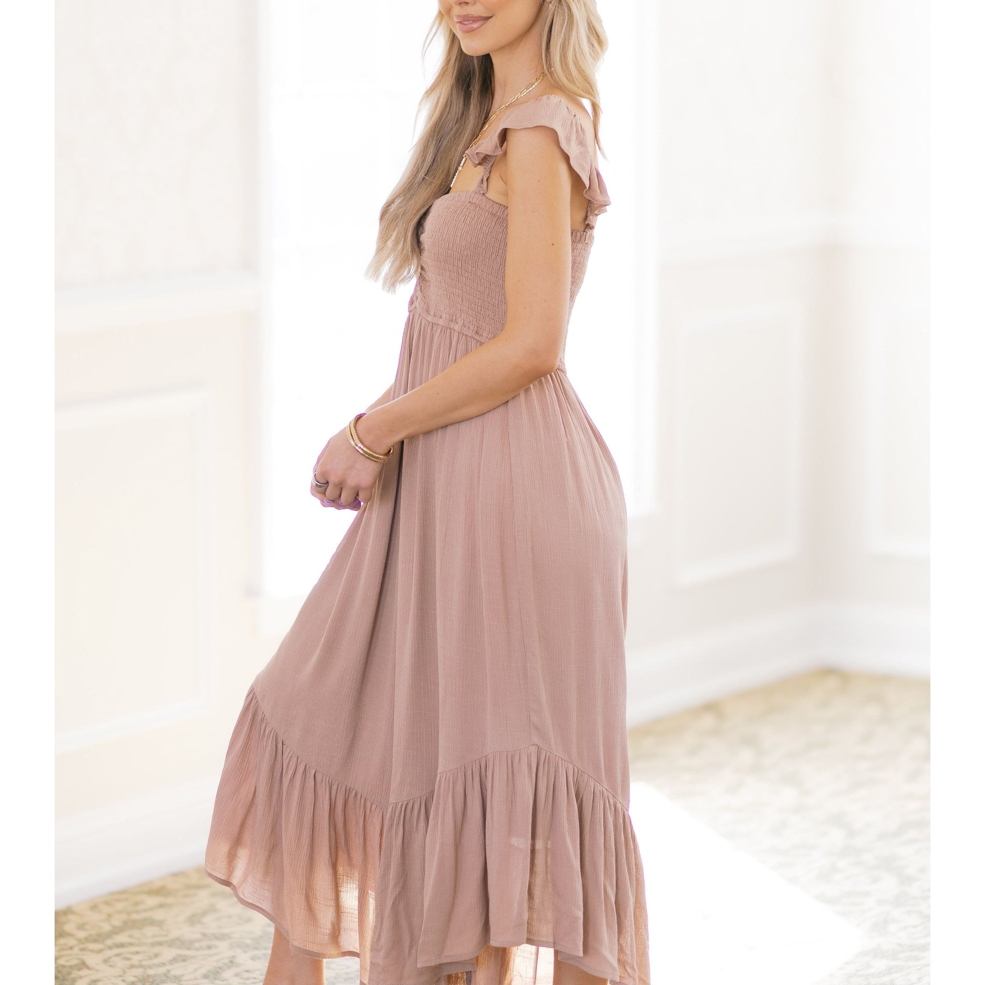 Be the epitome of bohemian comfort in the Boho Bliss Wide-Leg Jumpsuit. With a smocked bodice and ruffle elastic trim, this jumpsuit offers a relaxed fit and flowy silhouette for ultimate comfort. Lined through the bottom pants, it is made with flowy woven fabrication for a feminine and easy look.