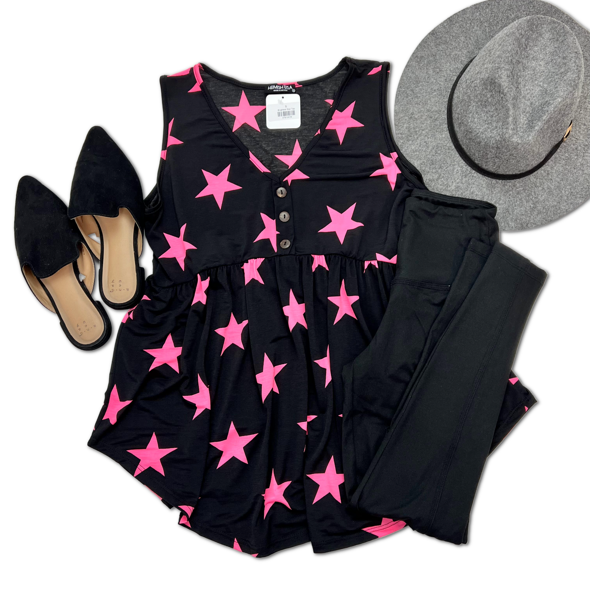 Shine bright in our Brightest Star Top! This sleeveless top features eye-catching neon pink star details and a flattering babydoll fit. Complete with button details on the bust, this top is sure to be a star in your wardrobe! (No one will miss you in a crowd!)