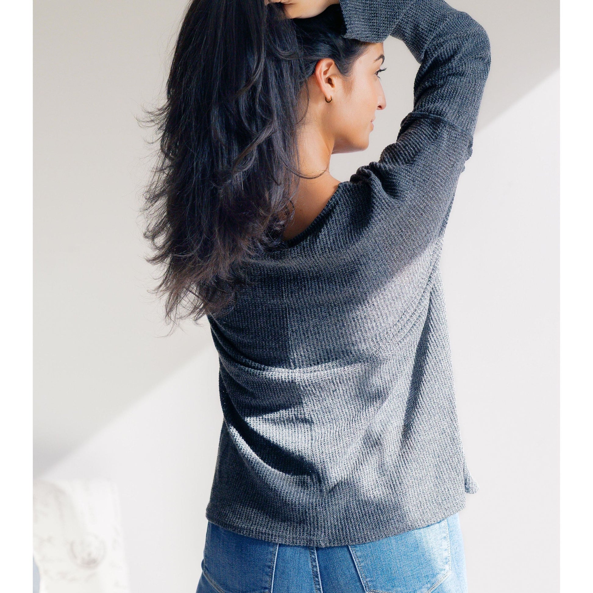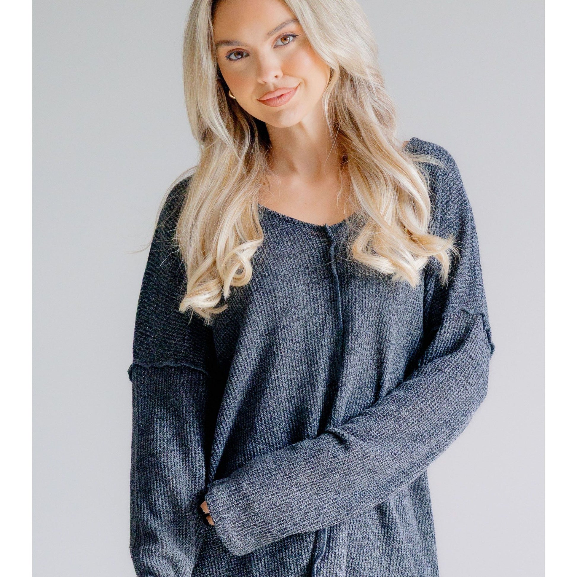 Wrap yourself in comfort with our Charcoal Mirage Long Sleeve! Featuring a relaxed, oversized fit and airy loose knit, it’s just right for cooler days. The v-neck and long sleeves bring a stylish edge, while the reverse stitch detail adds a fun, one-of-a-kind flair. Stay cozy and cool with this must-have!
