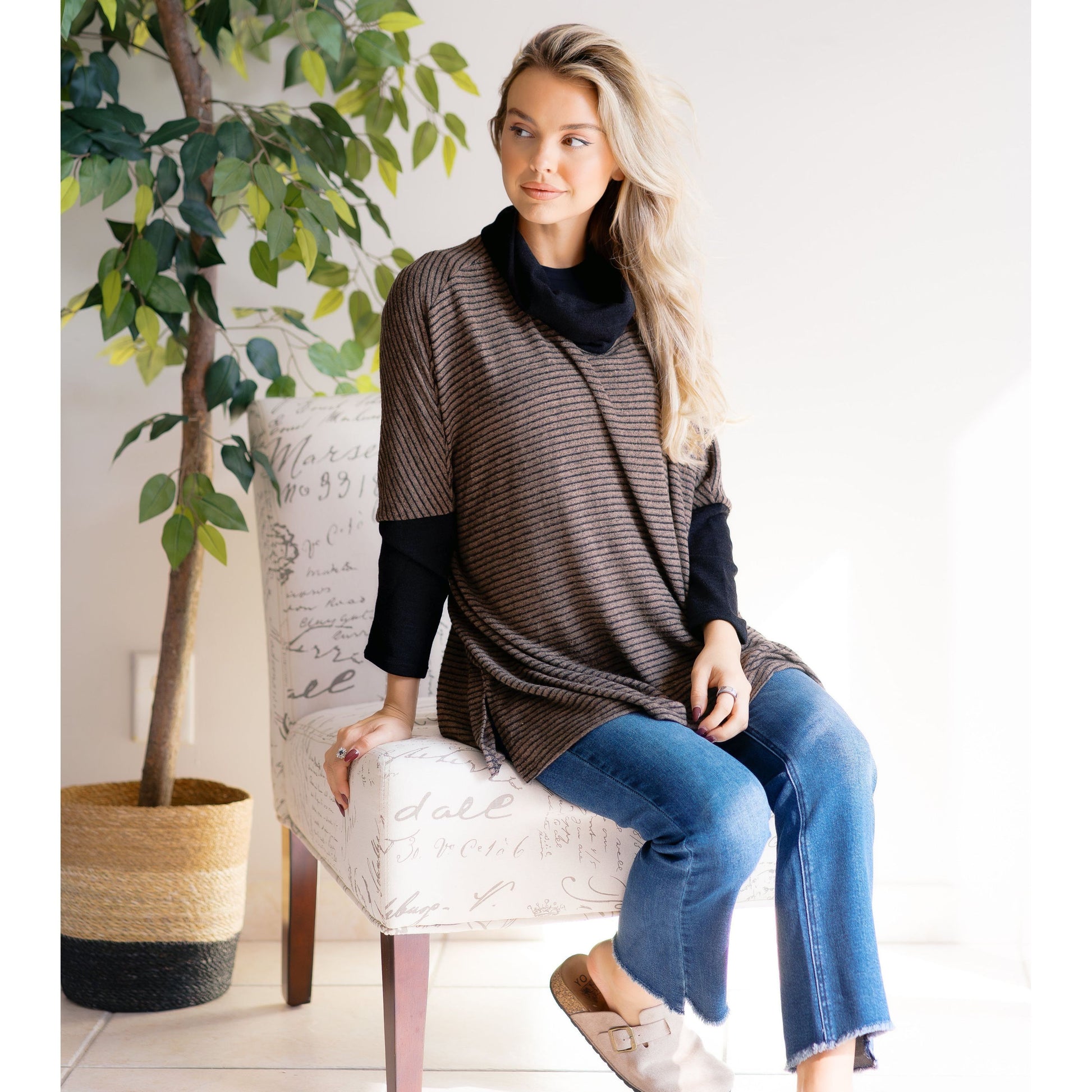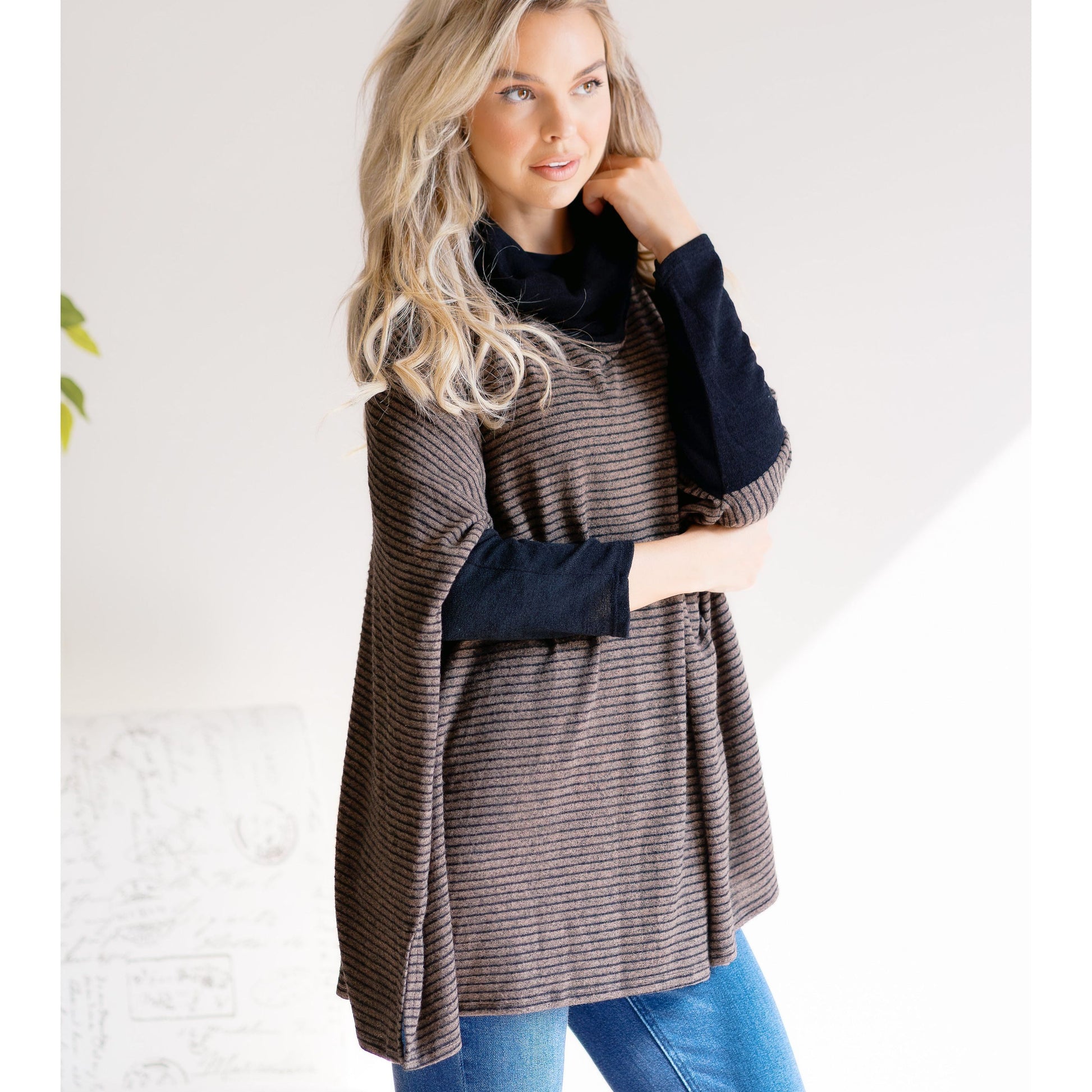 Meet your new favorite chill companion: the Chestnut Roast Duo Top. This relaxed-fit brown shirt pairs perfectly with a cozy black cowl and sleek black sleeves for that effortlessly cool vibe. Whether you're lounging at home or out for a casual stroll, its comfy fit keeps you feeling snug while looking stylishly laid-back. Slip it on and let comfort brew all day long!