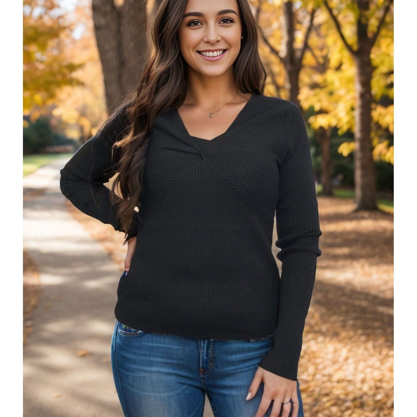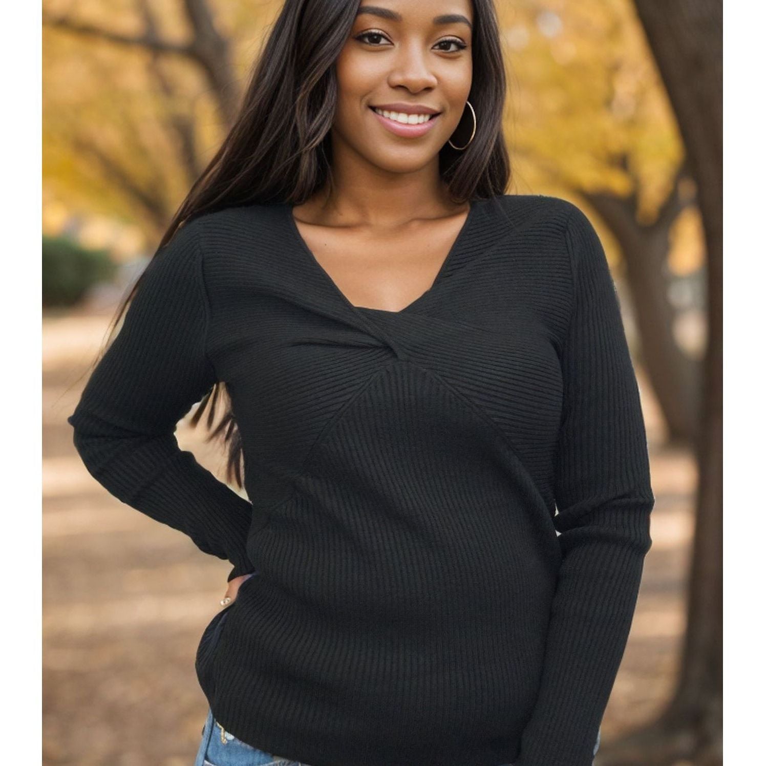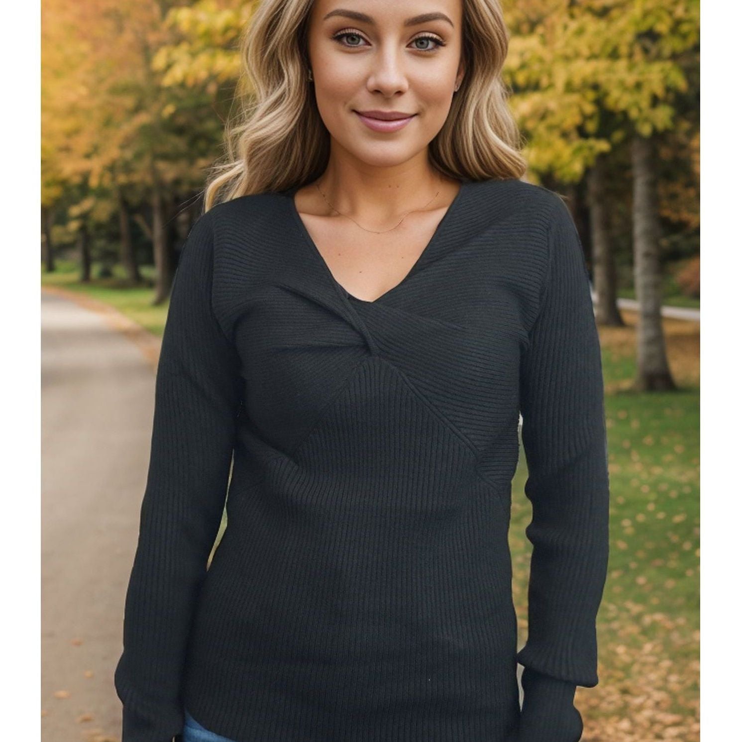 Unwind and look fabulous in the Don't Get Too Twisted - Darkest Black. This solid knit top features a flattering v-neck, gathered front detail, and long sleeves. With a fitted silhouette that hugs your curves in all the right places, you'll feel confident and comfortable while turning heads.