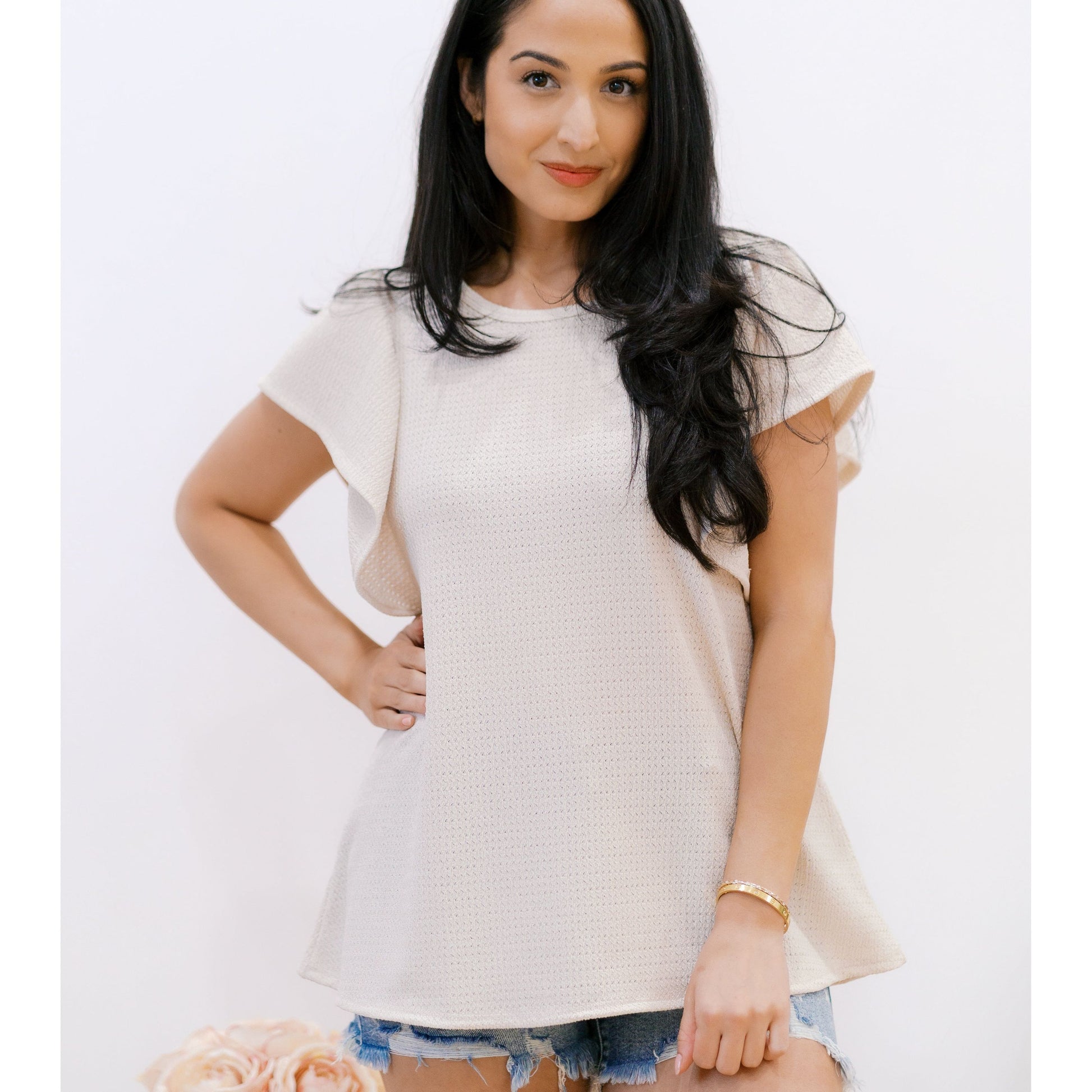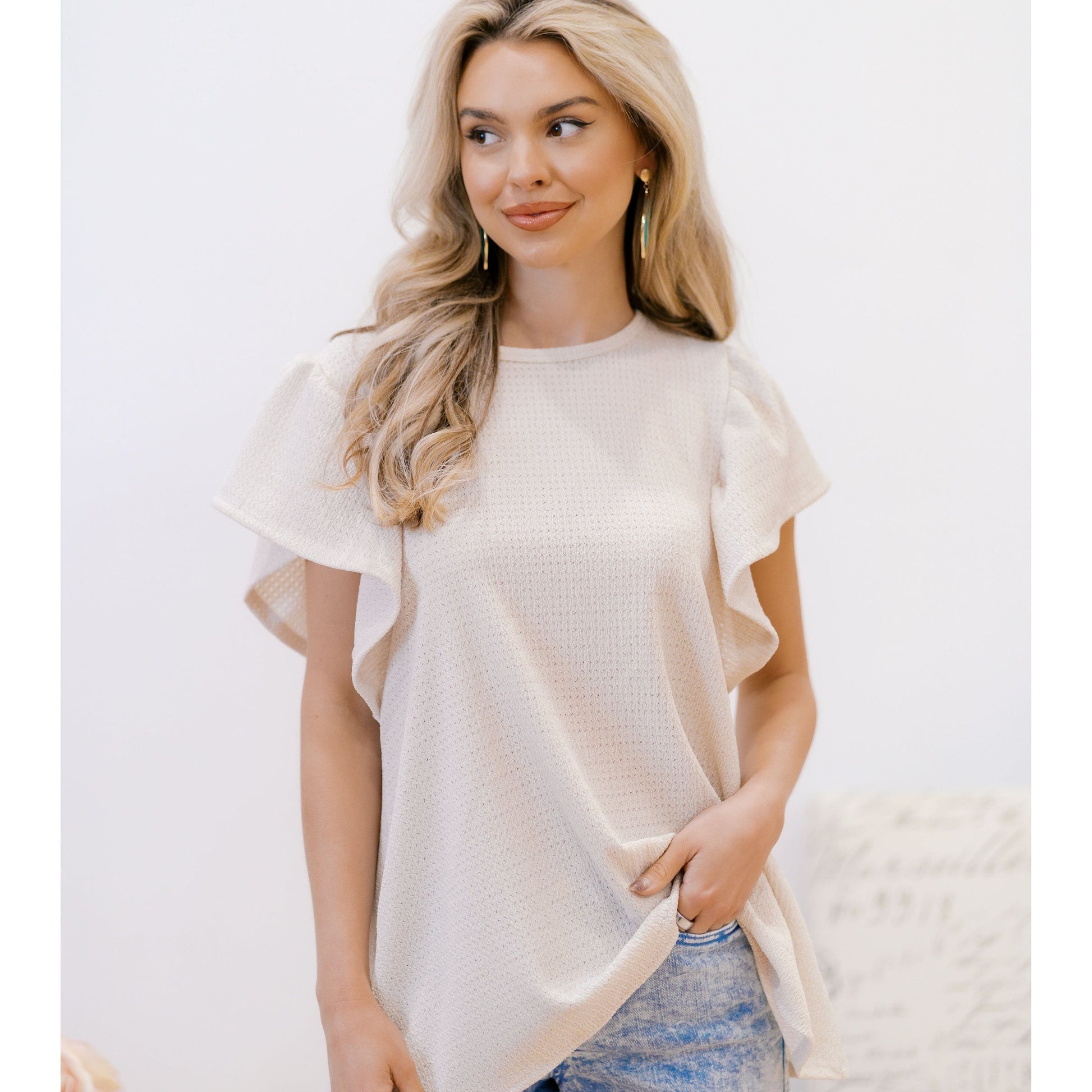 Get ready to flutter your way to style with our Elle Ruffle Top! Featuring flutter sleeves and a sand beige color, this playful top will add a touch of whimsy to any outfit. Perfect for a fun day out or a casual night in.