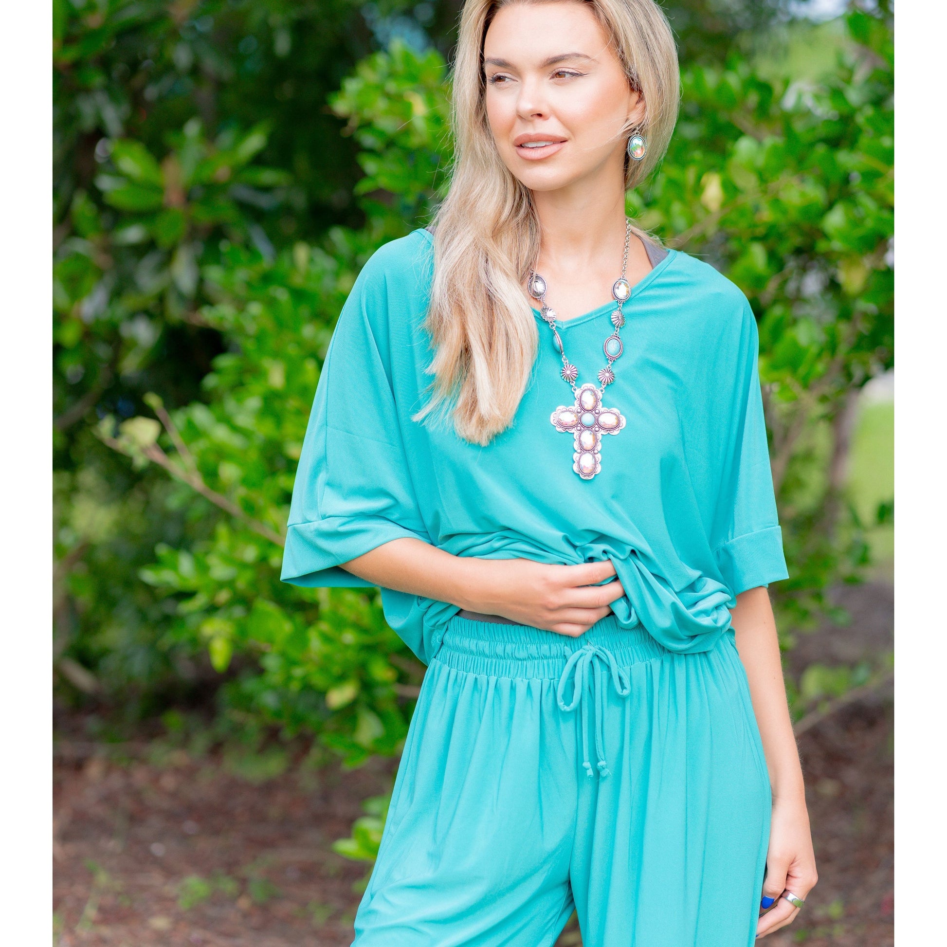 Jump into the dreamy world of the Emerald Mirage Set! Featuring a poncho top that adds a hint of mystery, this set keeps you both comfortable and stylish. Whether you're heading out for a fun night with friends or enjoying a cozy evening at home, let your inner mirage shine bright and playful.