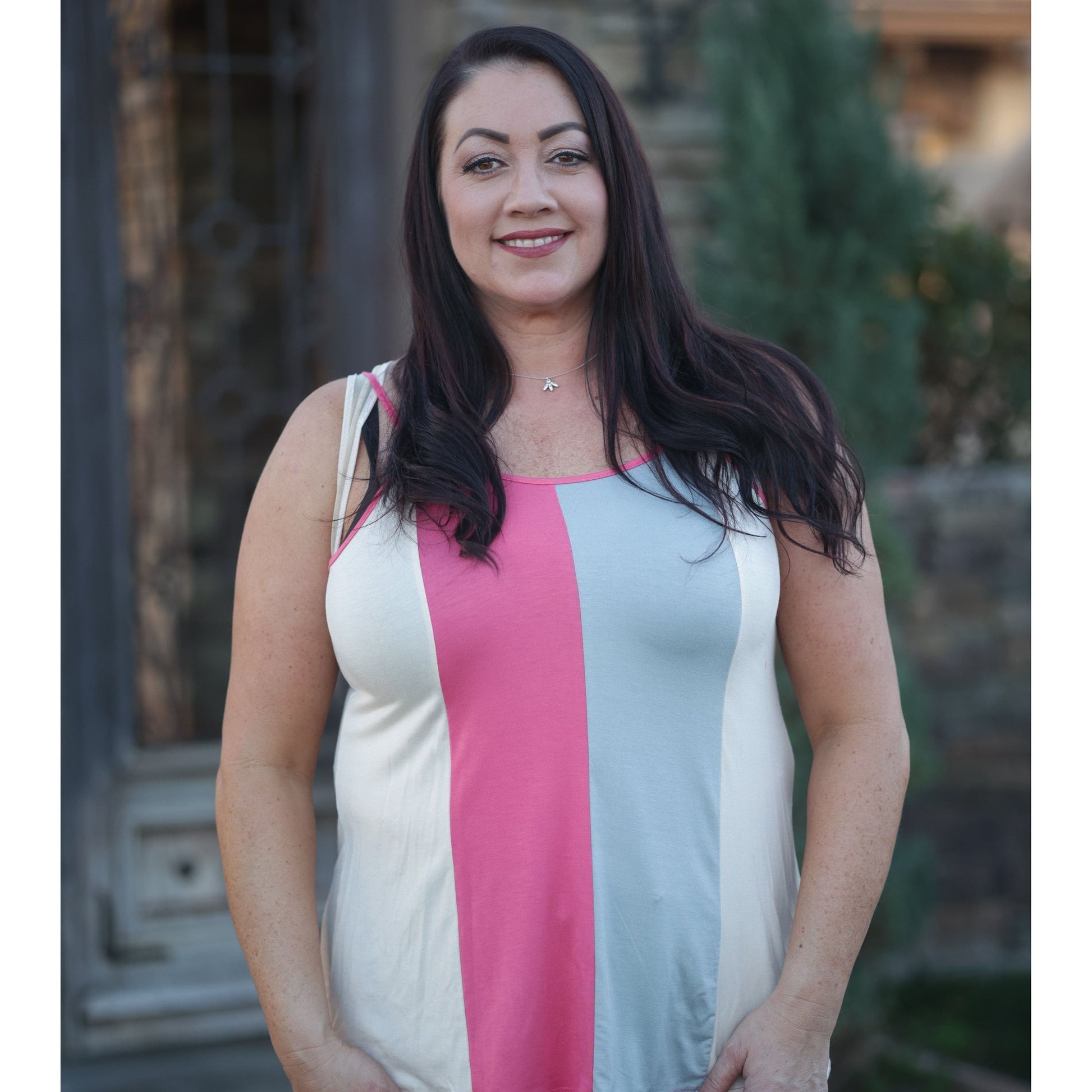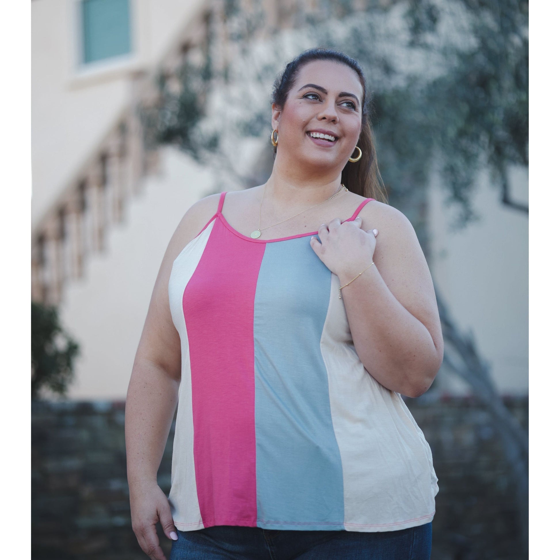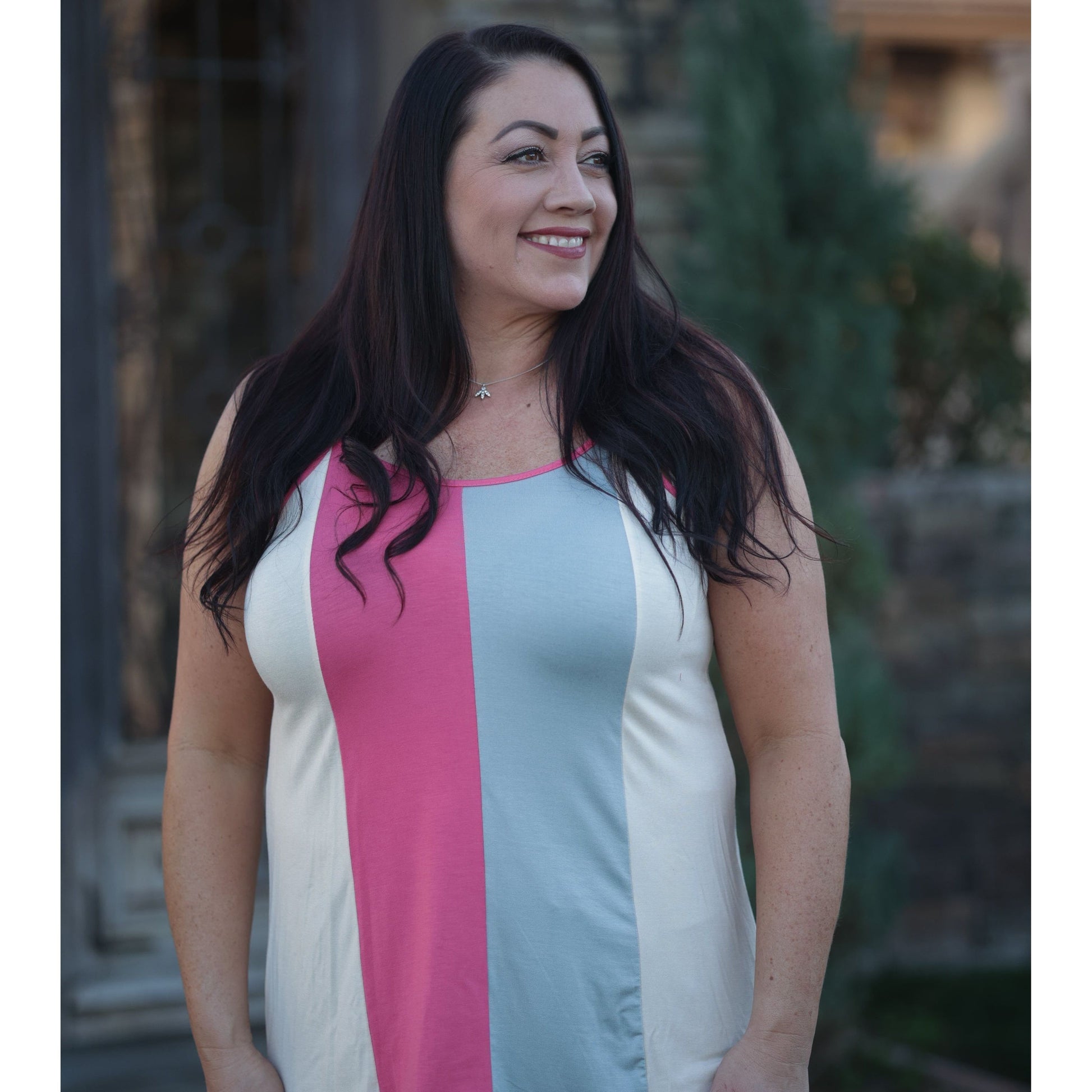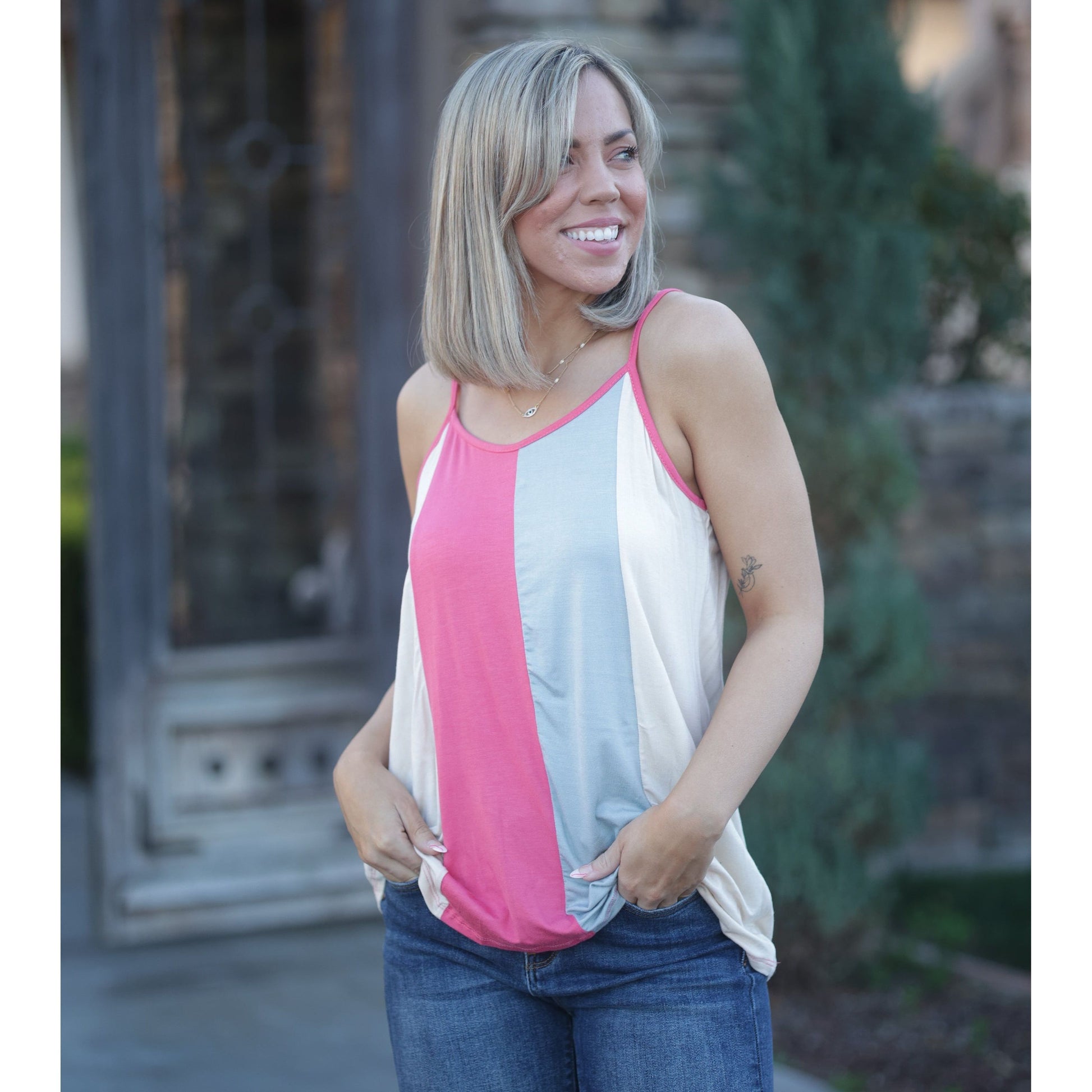 This tank is giving us total beach vibes with the coral, grey and taupe colorway. With a relaxed fit, this tank features a v-neck and rounded hem.