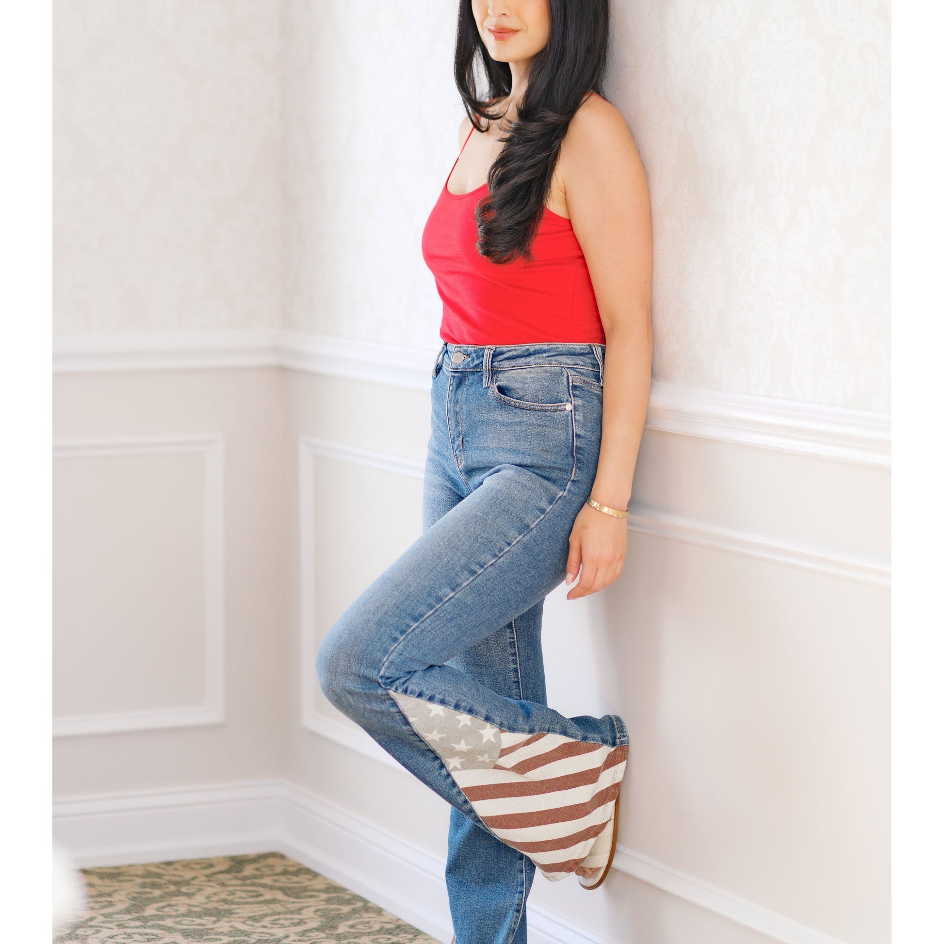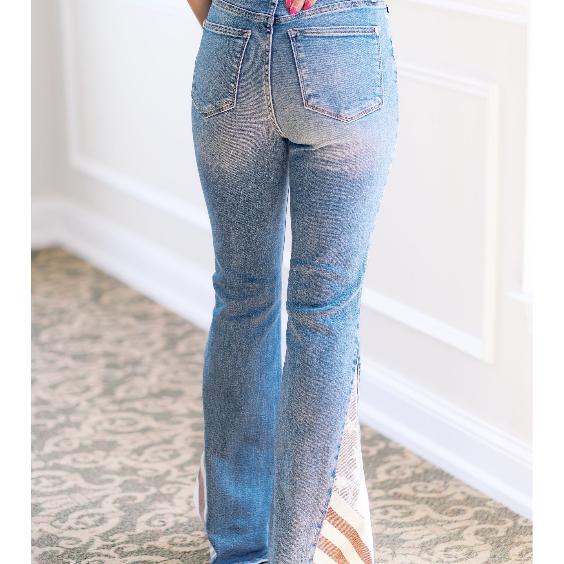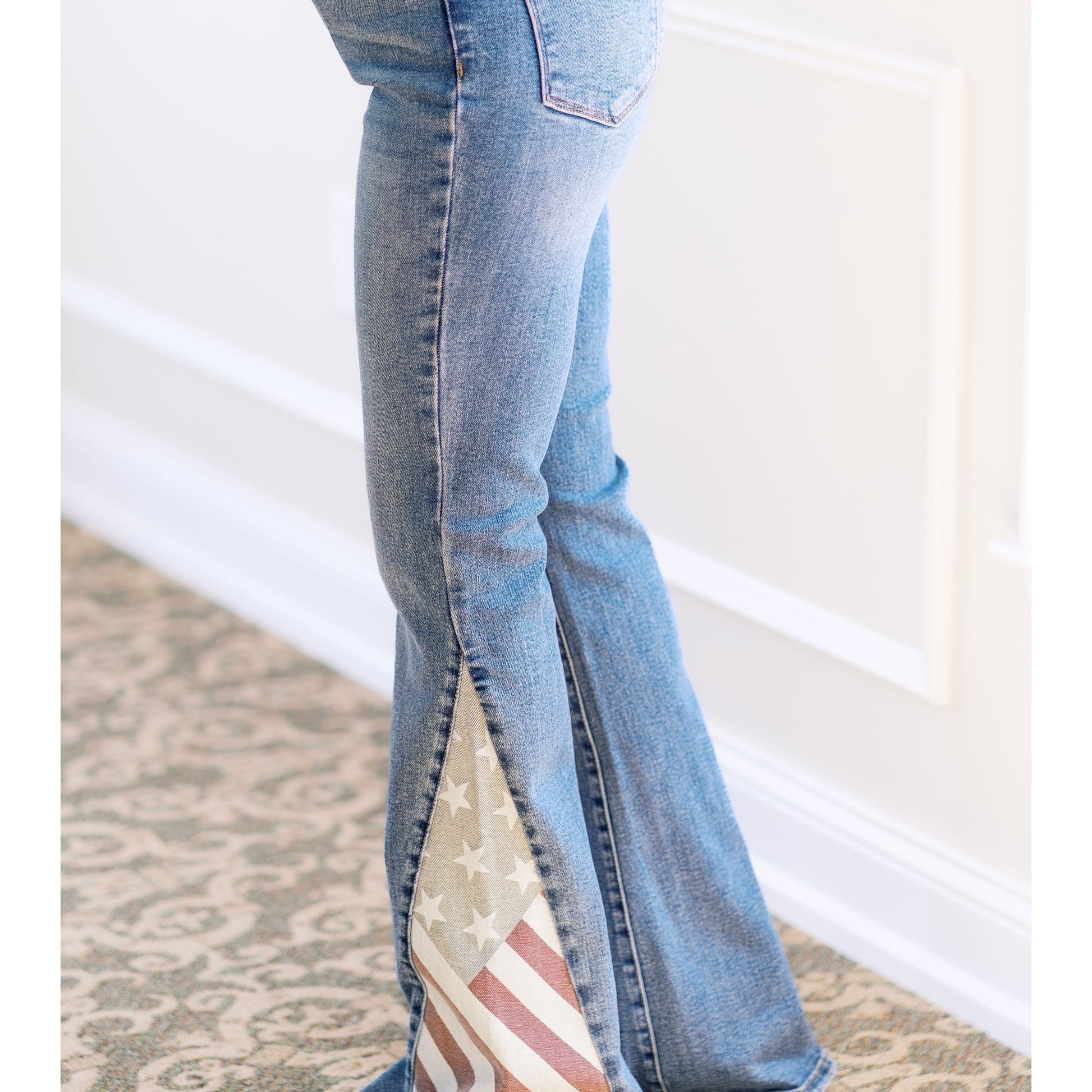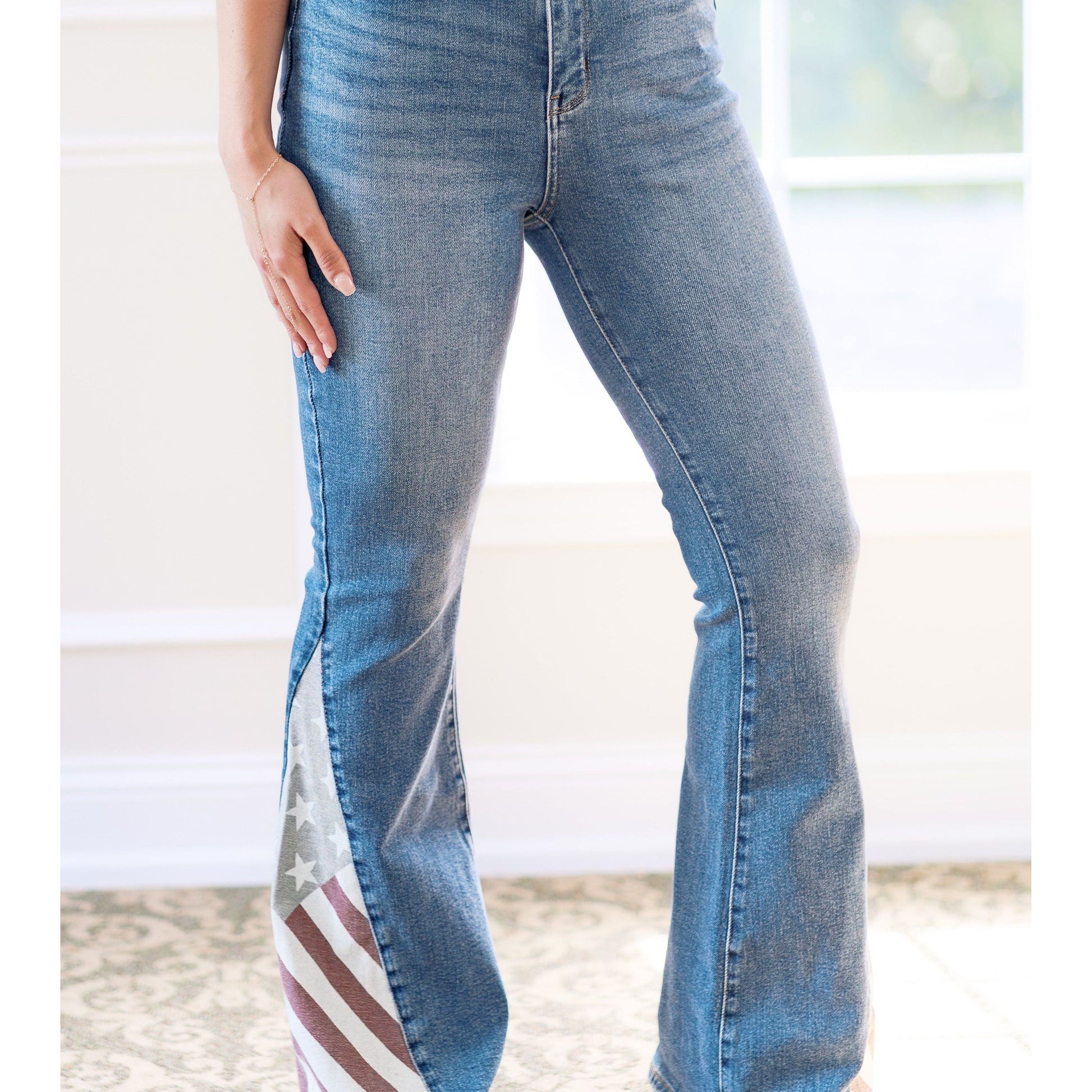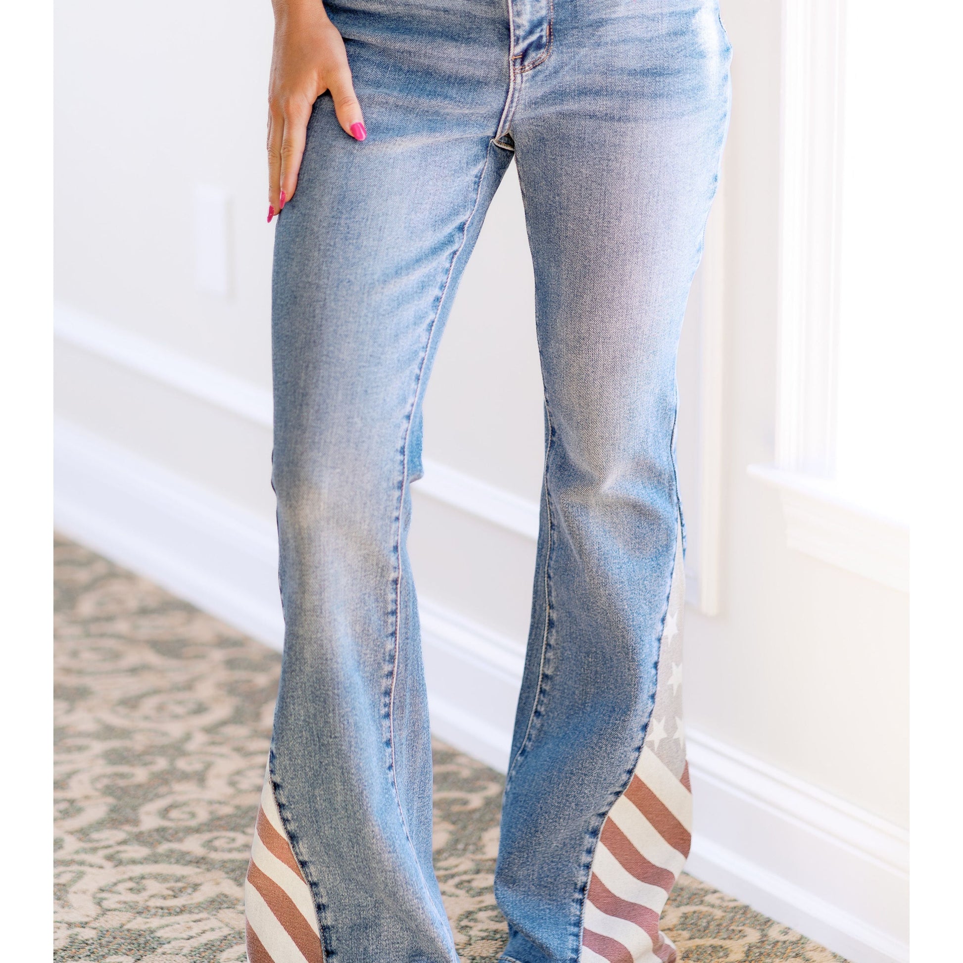 Embrace your freedom with our Freedom Rings Judy Blues! These American flag flares not only make a statement, but also provide a comfortable and stylish fit. Show off your patriotic spirit with a touch of flair. (We promise they won't restrict your freedom - in fact, they give you more!)