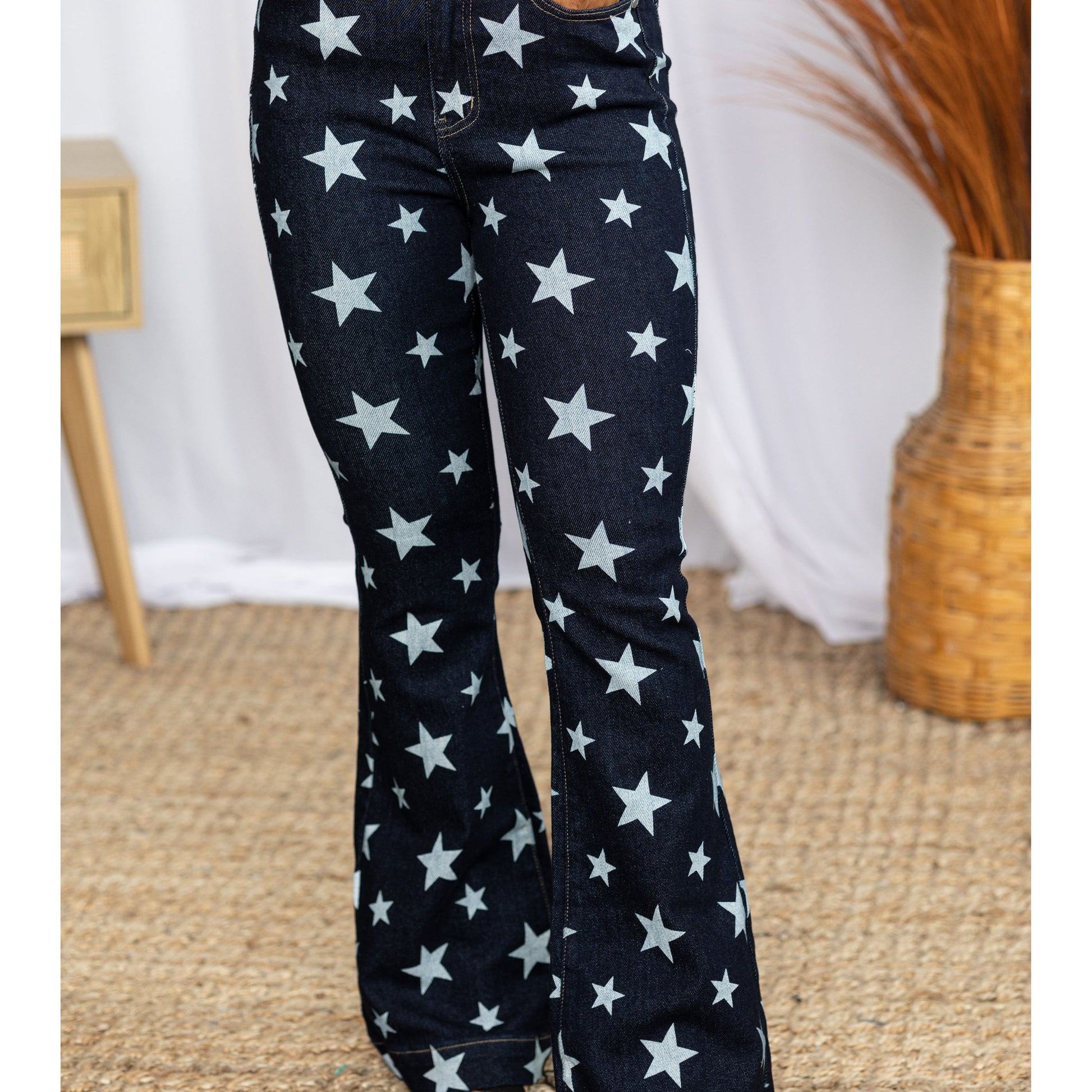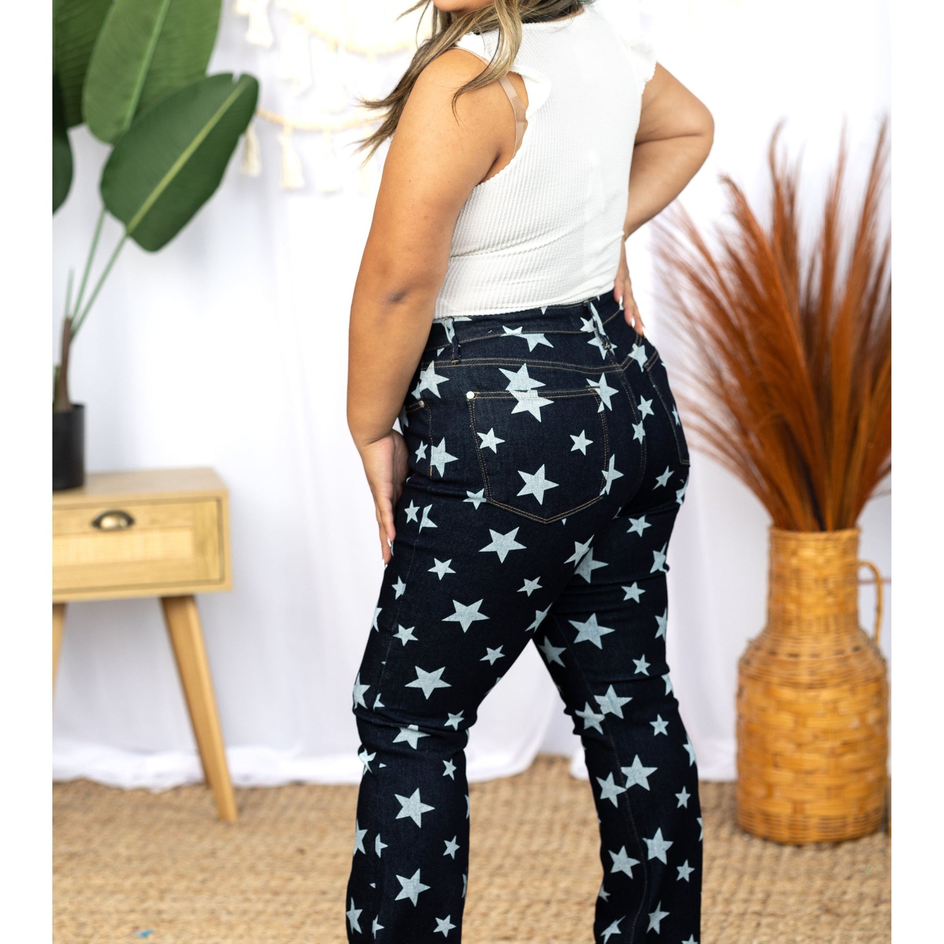 Light up the night with these Freedom Stars - Judy Blue Jeans! Showcase your sass and stand out from the crowd by wearing these high-waisted, star-printed trousers with a wide flare. It's a look that's sure to get you noticed! 🤩