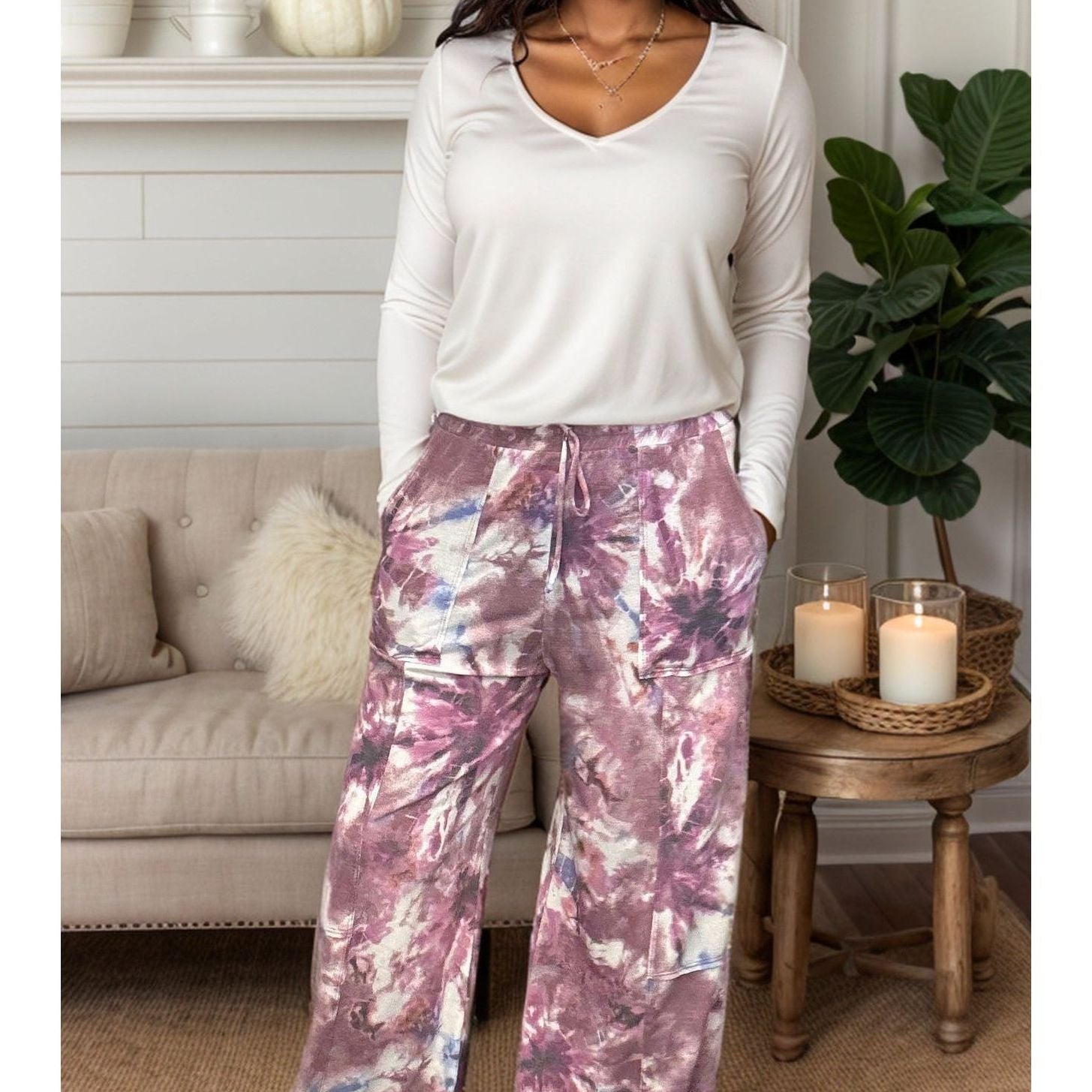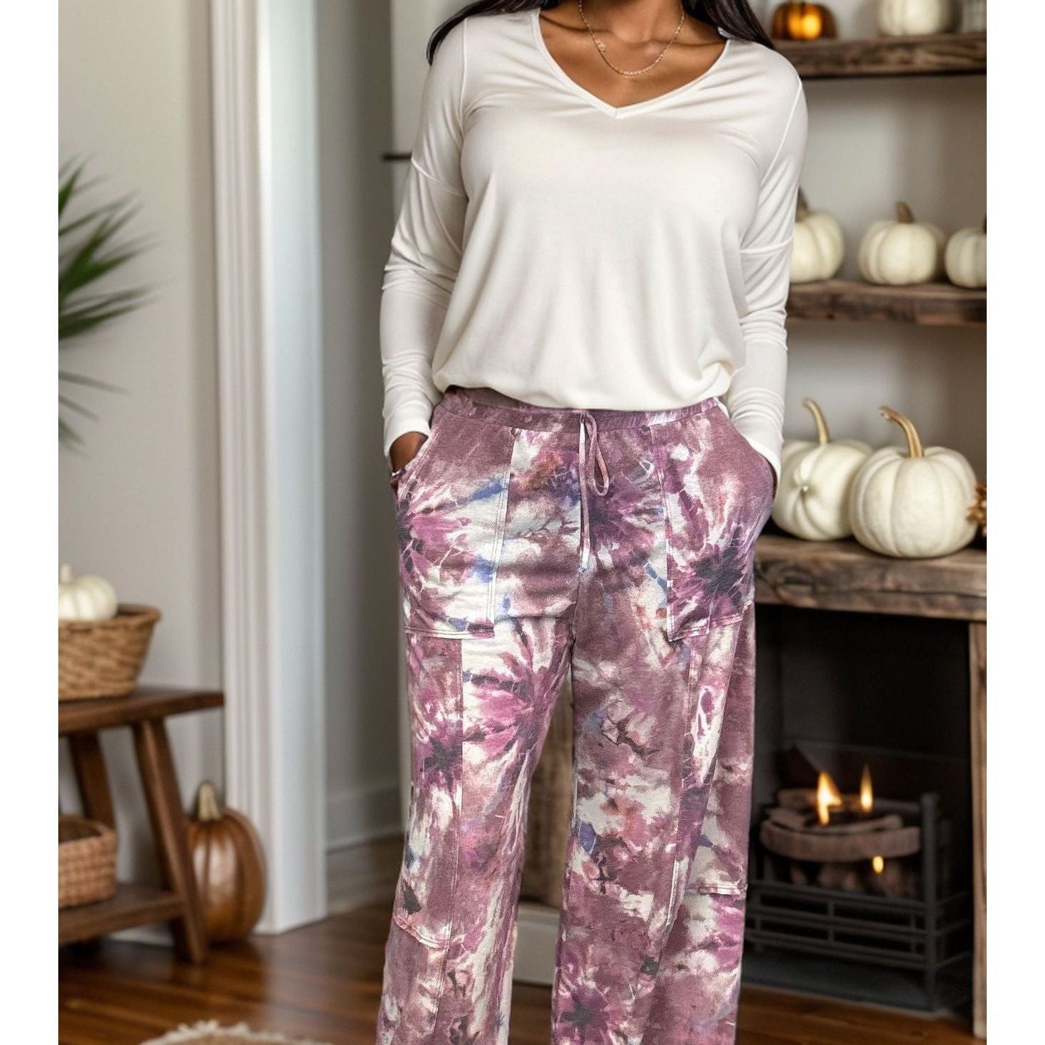 Get grooving with these Galaxy Vibing bottoms! The funky purple tie dye pattern creates a playful vibe while the loose fit provides all-day comfort. The elastic waist with drawstring and pockets add convenience, plus there's a matching top to complete the look. Time to vibe out in style!