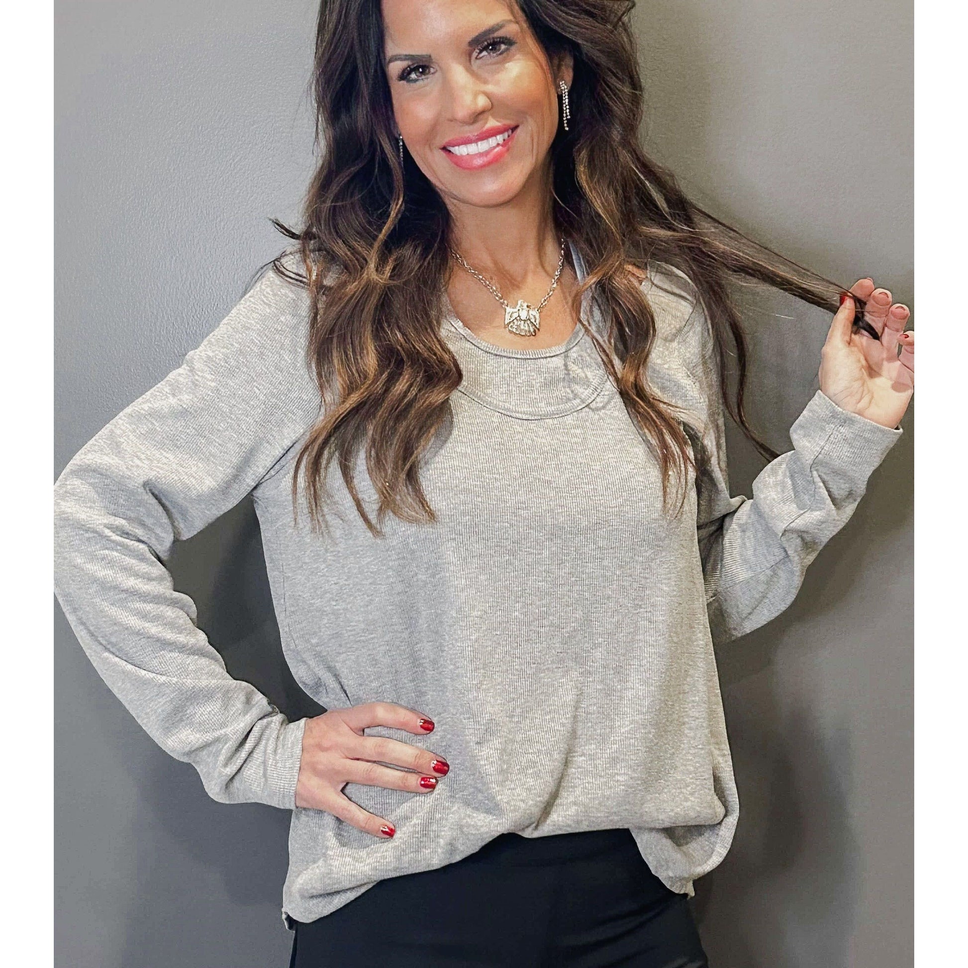 Stay warm and stylish with this heathered grey top. This top features a layered look with heather grey thermal knit for added warmth and comfort. The round neckline also includes trendy shoulder cutouts for a touch of flair. Never feel alone in your fashion choices with this unique and cozy top!