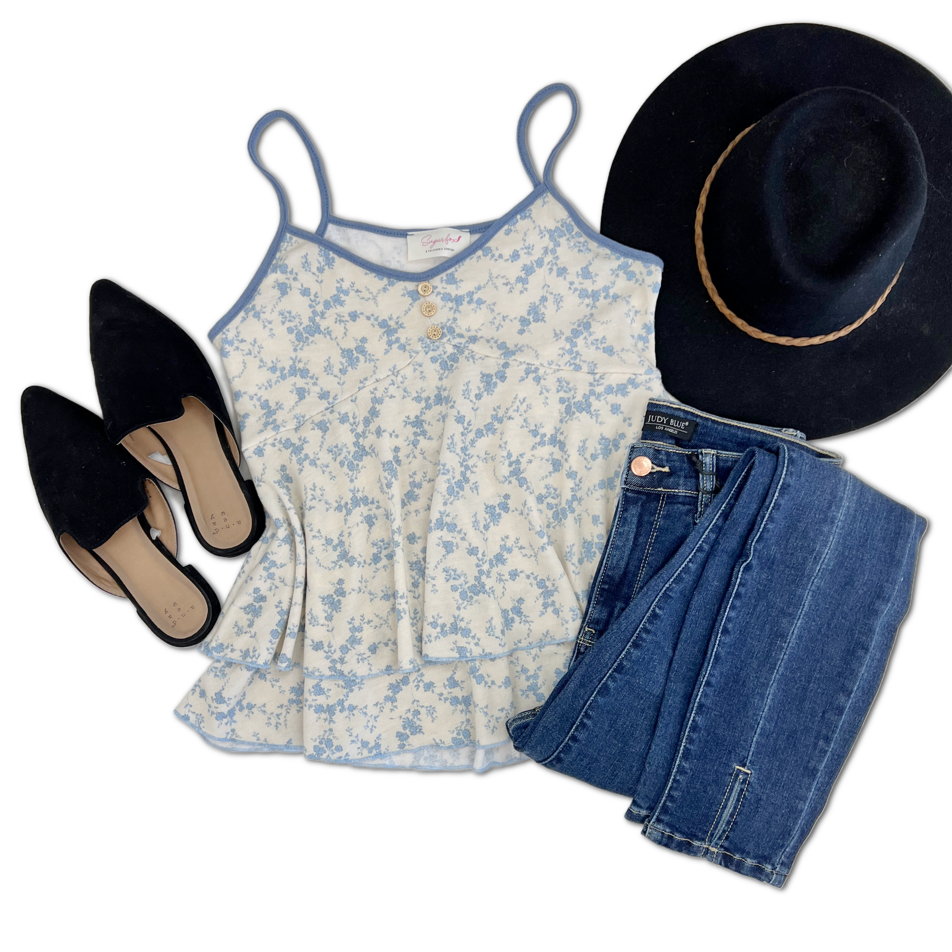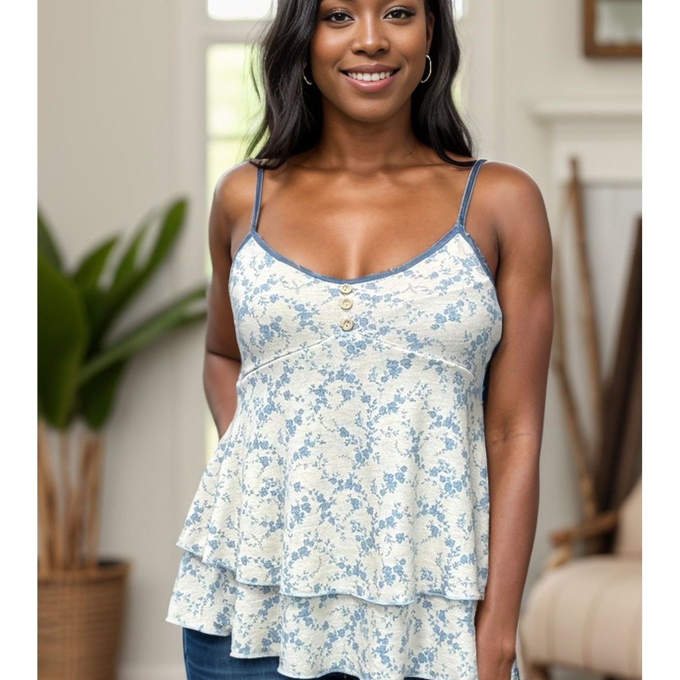 Wrap yourself in comfort with this double ruffle hem tank. With v-neck and spaghetti straps, you'll feel light and breezy. The cute button detail and baby blue trim with a white floral print make this top as sweet as a lullaby.