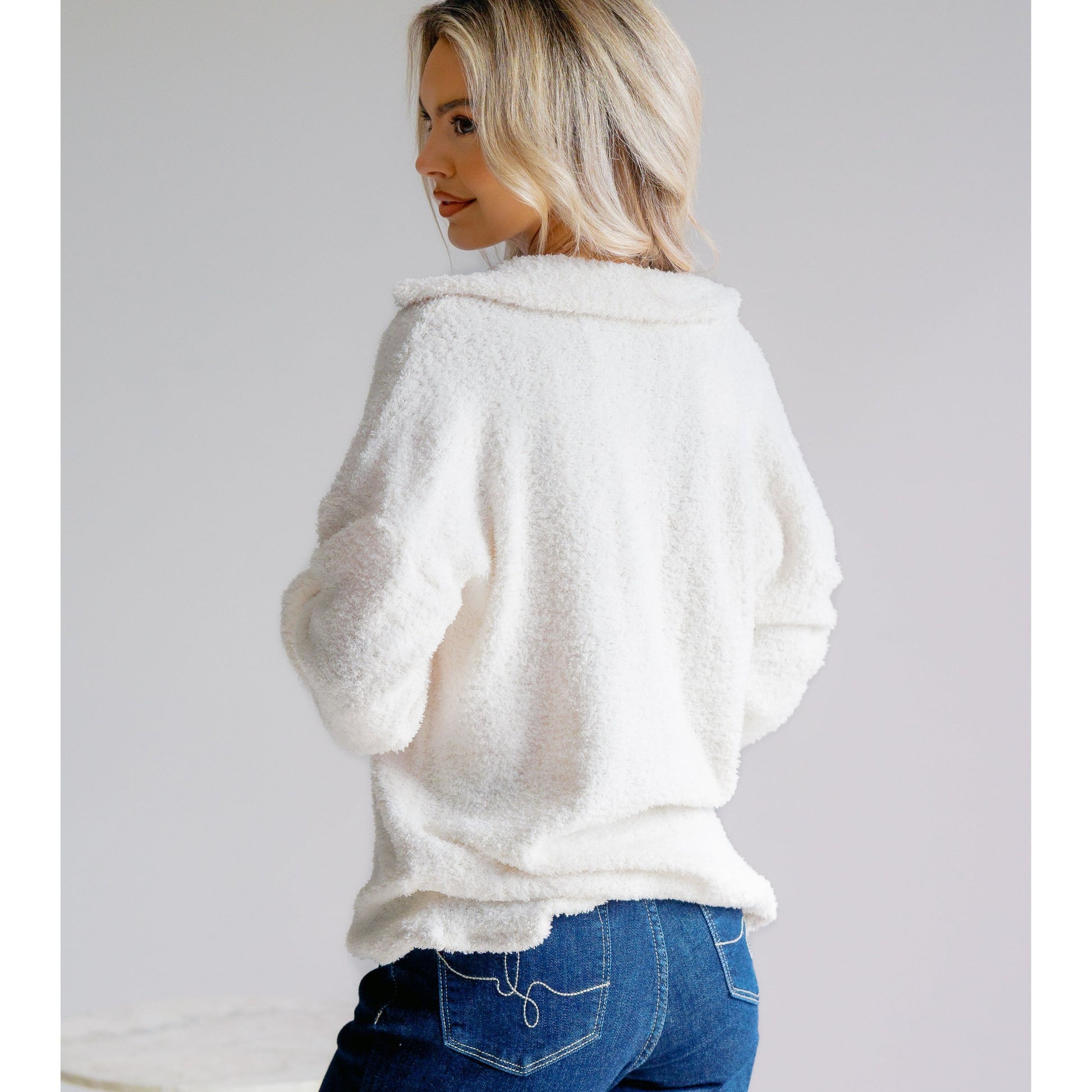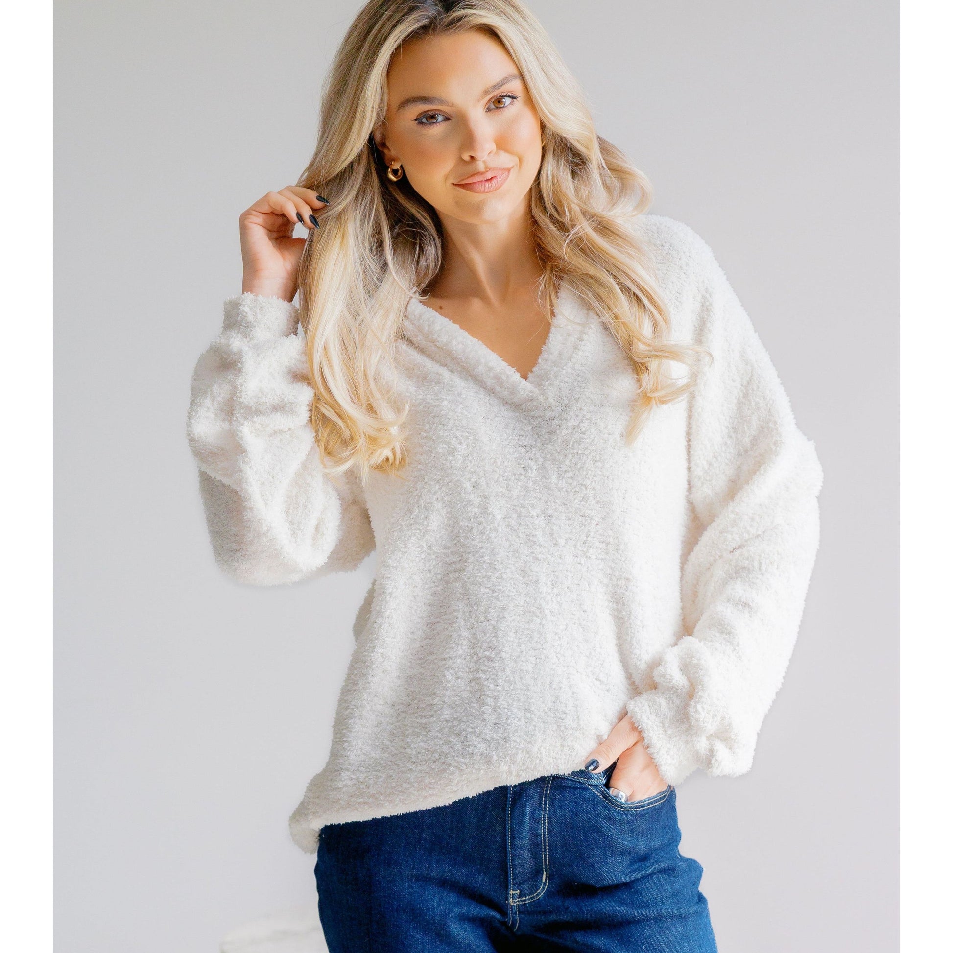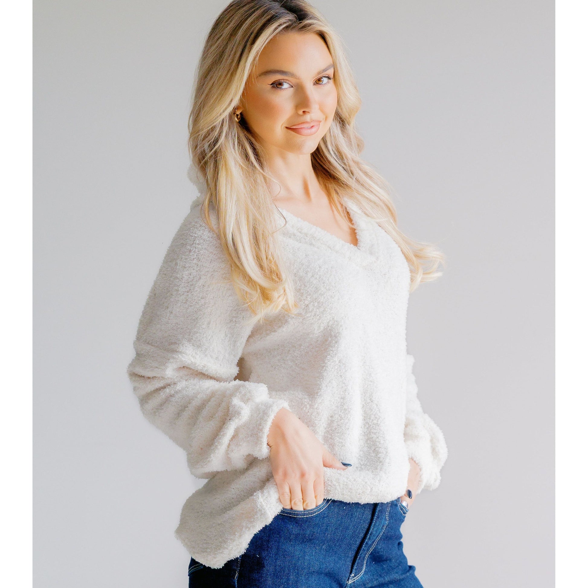 Meet the Luminous Cloud Top! Featuring long puff sleeves and a split V-neck, this cozy, fuzzy top combines warmth with flair. Great for chilly nights curled up or entertaining days out—and did we mention it’s delightfully fuzzy?