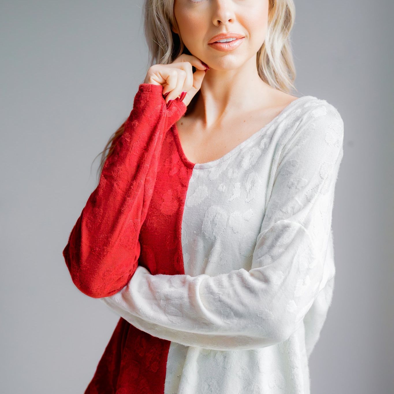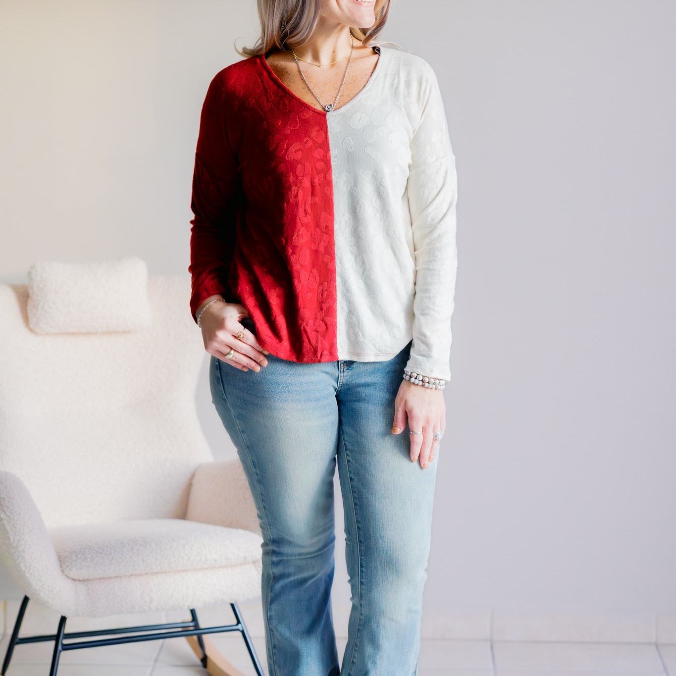 Embrace your wild side with our Merry Mint Split Top. Sporting a distinctive half red, half ivory look accented by a gentle cheetah print, this long sleeve tee is designed to turn heads. The v-neck and super-soft fabric make it so comfy, you’ll never want to take it off. Add a splash of fun to your wardrobe with this playful favorite!