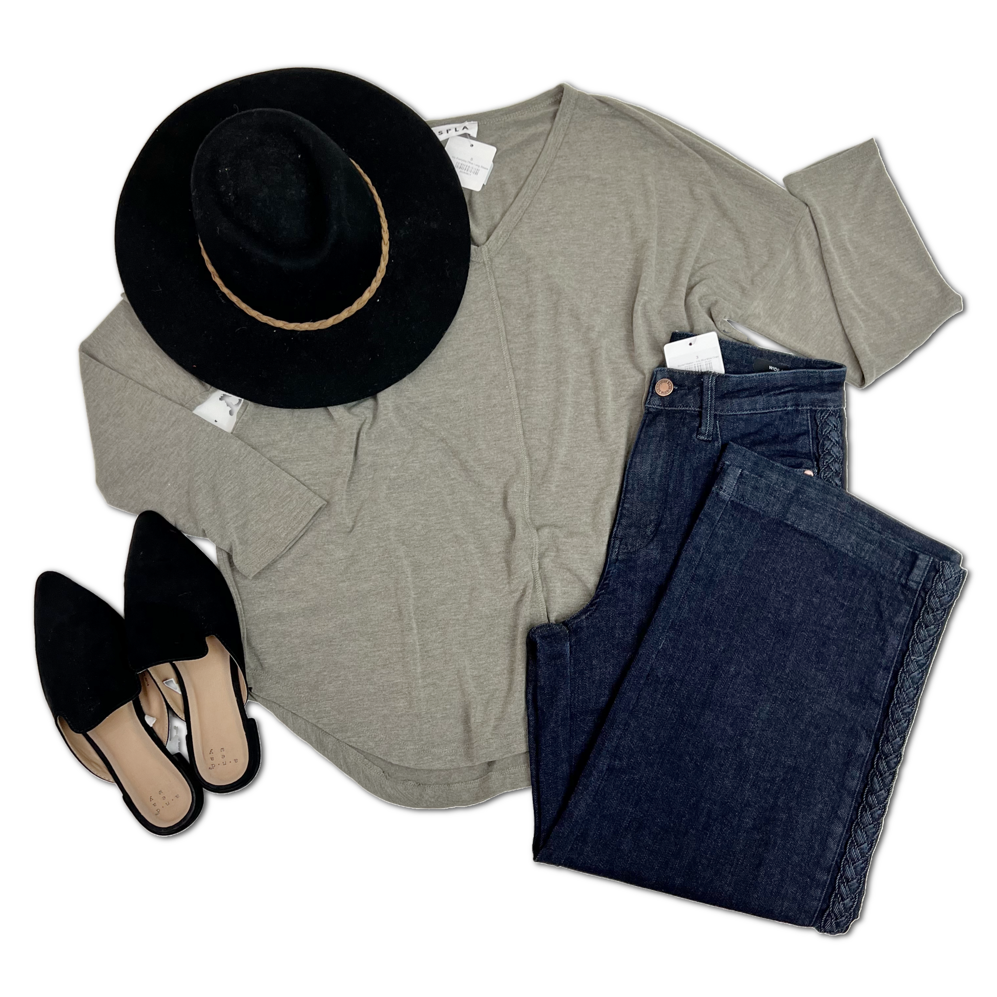 Unleash your playfulness with our My Everyday Olive Long Sleeve shirt! Designed with a relaxed fit and heathered olive color, this shirt offers both comfort and style. Featuring a v-neck, long sleeves, and dolphin hem, it's the perfect blend of quirk and fun. Don't miss the unique reverse stitch detail for an added touch of charm. Upgrade your everyday wardrobe with this must-have!