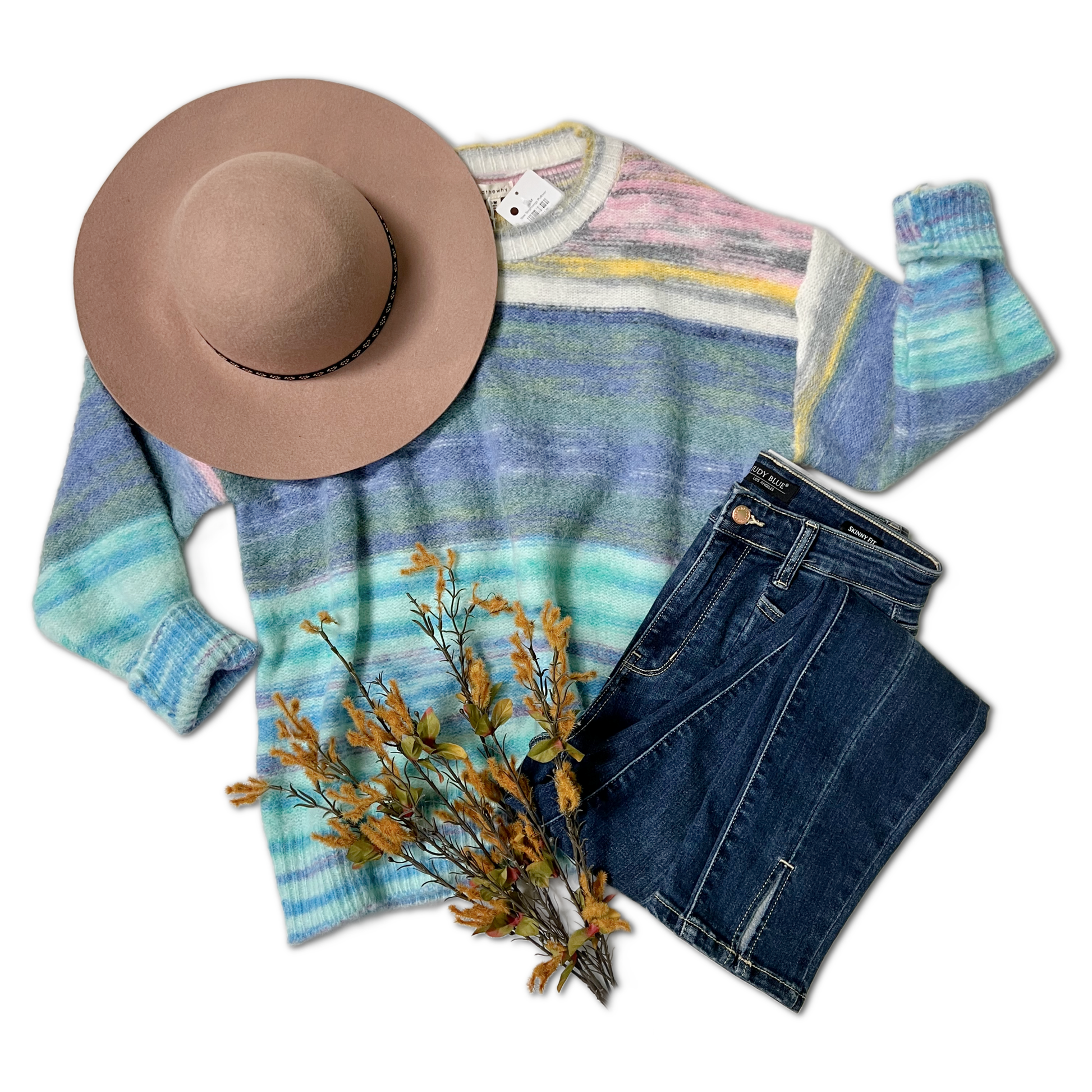 You'll start off your day in style with this cozy New Beginnings Pullover. Crafted from a soft brushed knit, this oversized top features a stunning watercolor stripe and a round neck. Look no further for your perfect look - the possibilities are endless!