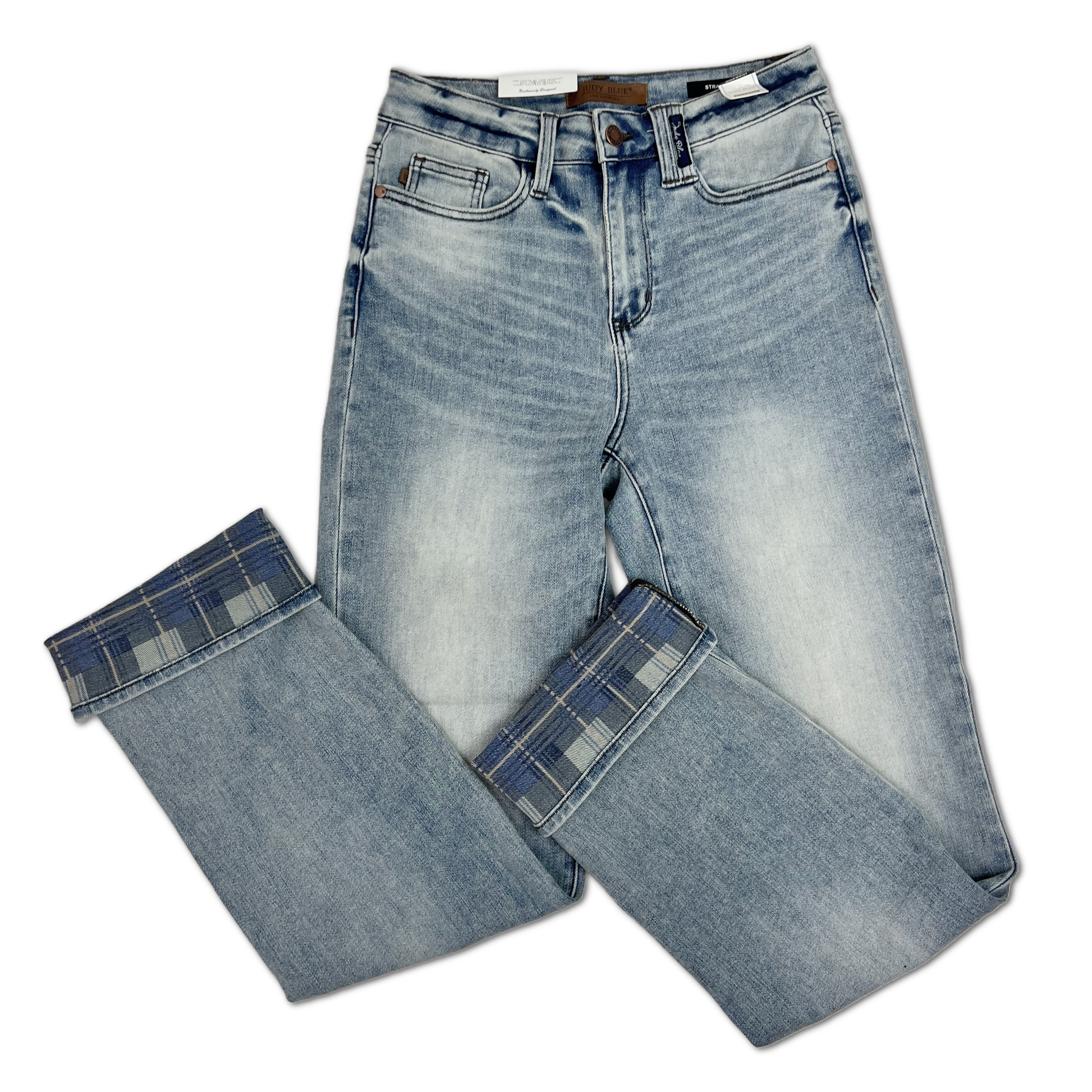 Rock your next look with these fabulously fashionable Judy Blue Jeans! They have an amazing stretch and high waist design to keep you comfy all day, plus a vintage wash and bold plaid cuff for a stylish pop of color. Cuff 'em or uncuff 'em - they're a surefire style hit, no matter what you choose!