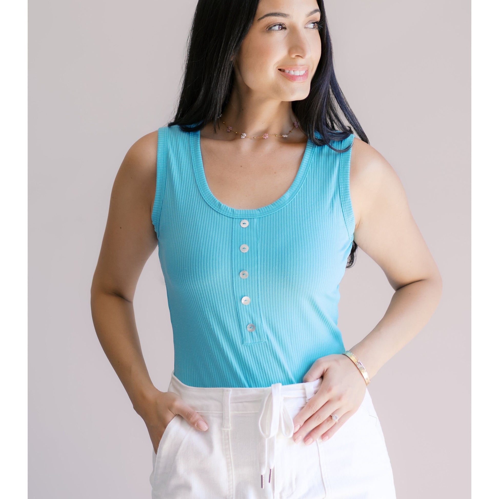 Get ready to steal the spotlight in our Ocean Eyes Bodysuit! Made from ribbed material, this scoop neck top features a unique button detail and sleeveless design. The snap enclosure makes it easy to wear, perfect for any occasion. Show off your playful side with this quirky and stylish piece. (Scoop up this bodysuit now, before it's gone!)