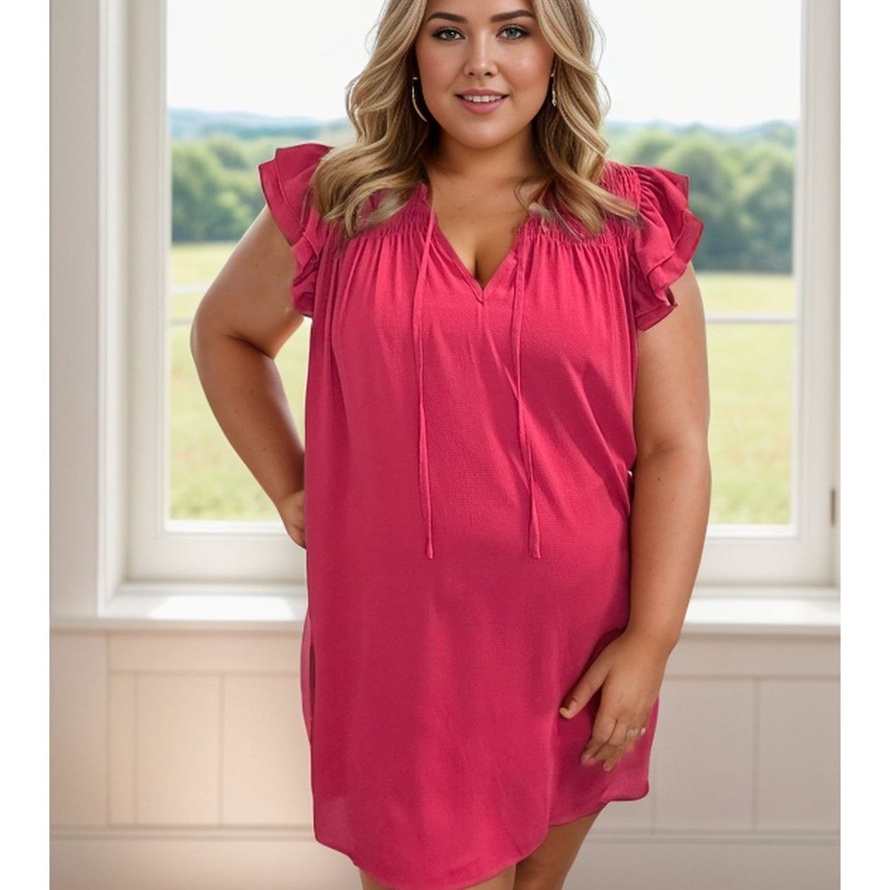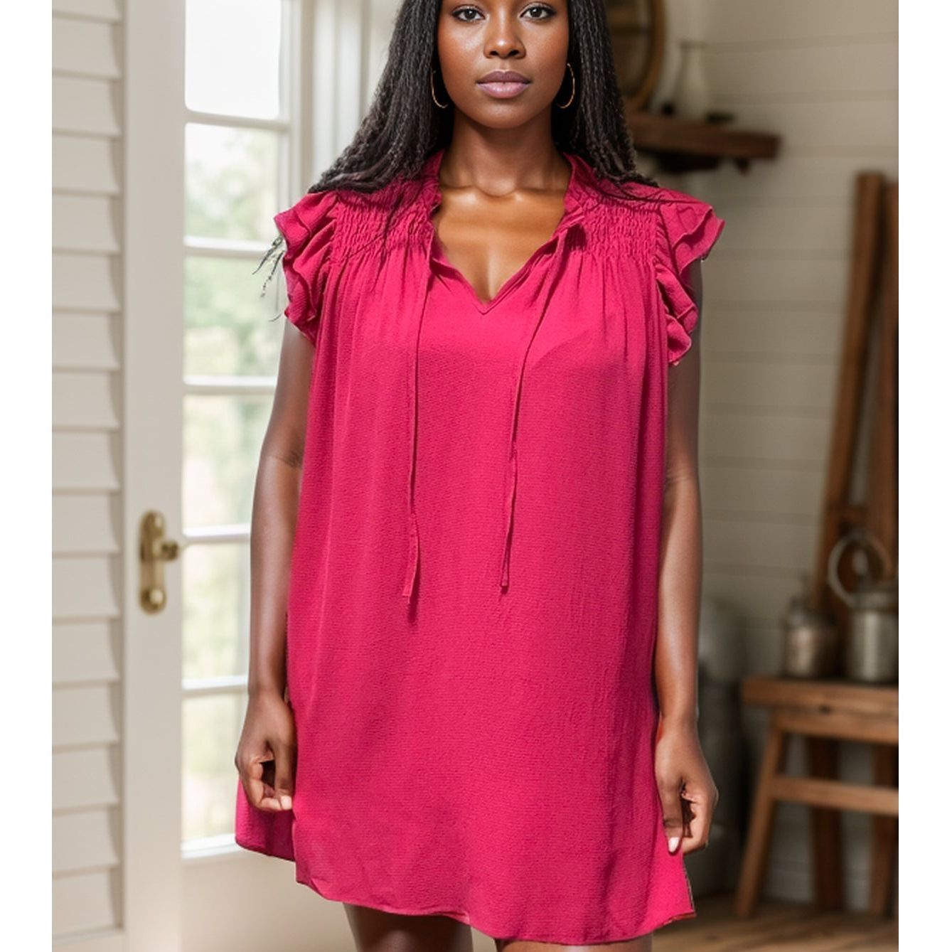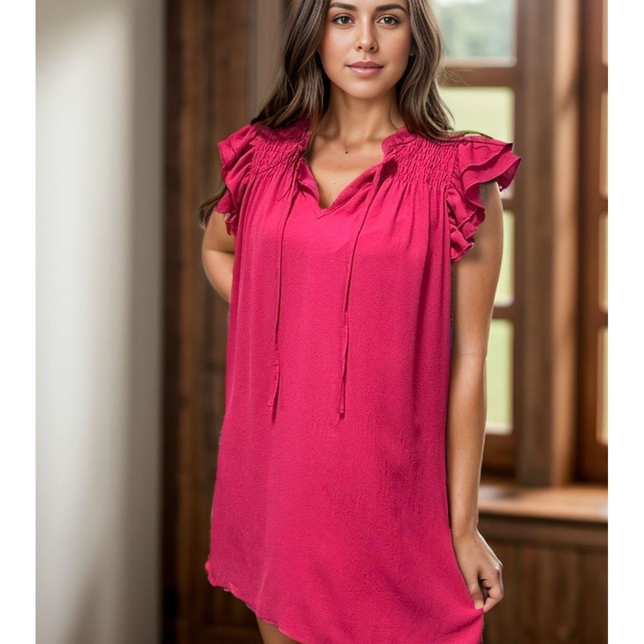 Get ready to spread your wings and have some fun in this fuchsia dress! With playful butterfly sleeves and a V-neck with a self-tie option, this relaxed fit dress is perfect for any occasion. Don't be afraid to stand out and show off your playful side!