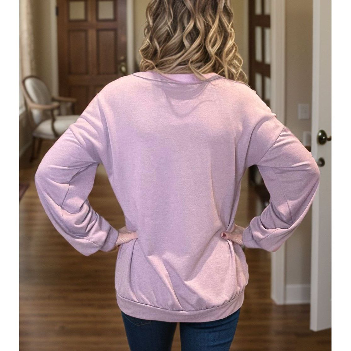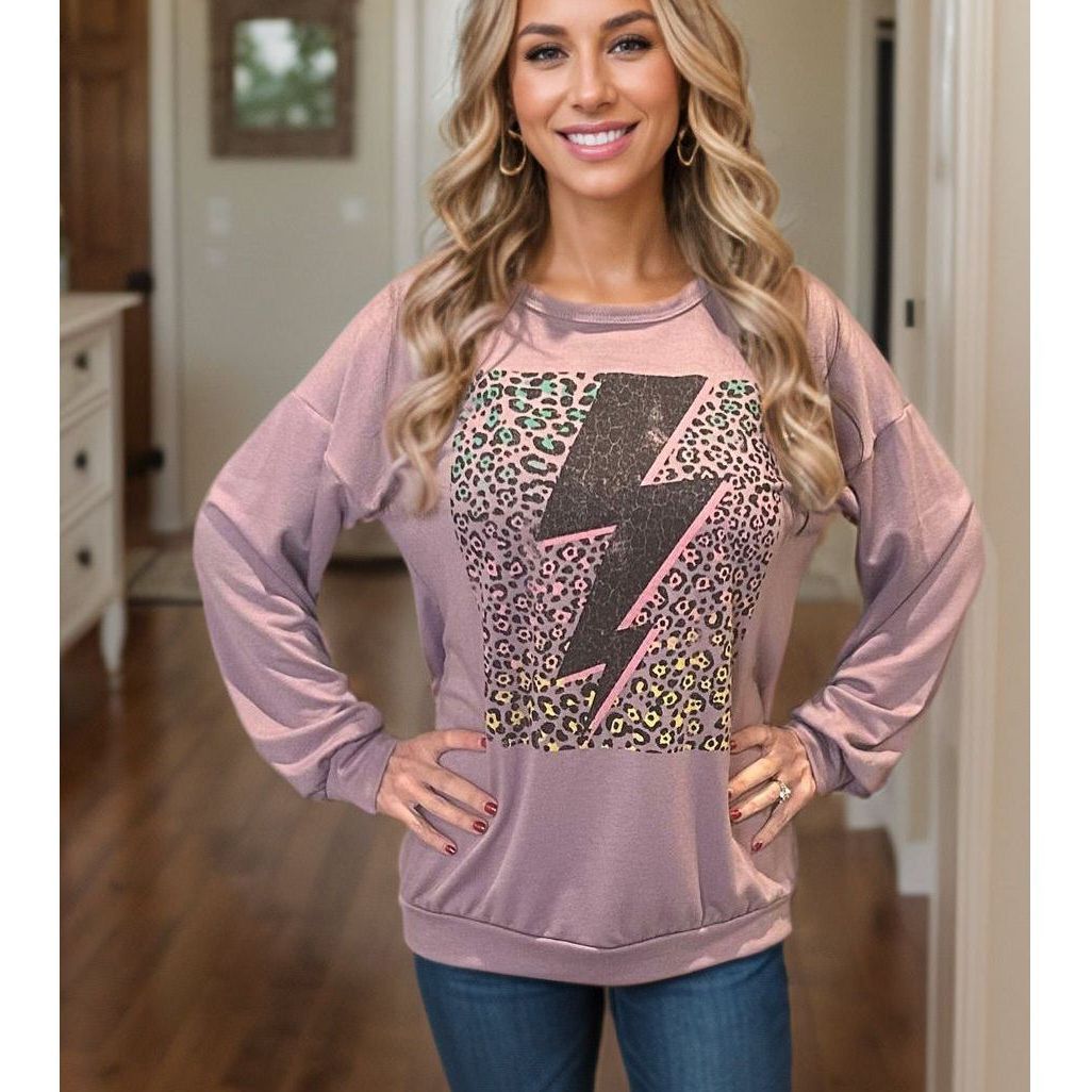 Get ready to "ride the lightning" in this lavender pullover! The round neckline and relaxed fit make it perfect for lounging, while the banded hem adds a touch of style. And with a bold graphic print, you'll stand out in this quirky and comfortable piece.