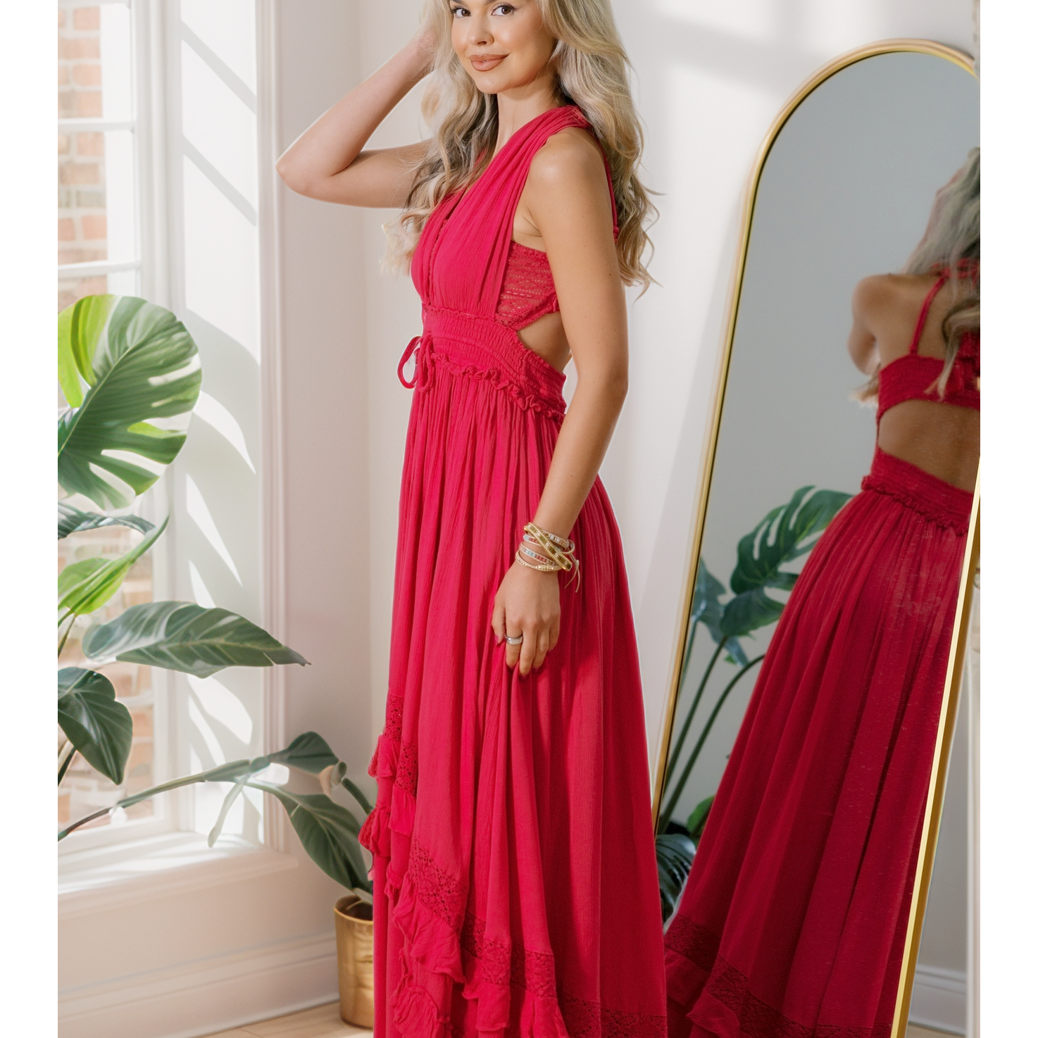 Add some flare to your wardrobe with the Ruffle & Radiance Maxi! This dress features playful ruffles and radiates elegance with its flowy silhouette. Perfect for any occasion, this dress will have you looking and feeling your best. (Maximize your style and confidence with this stunning maxi dress!)