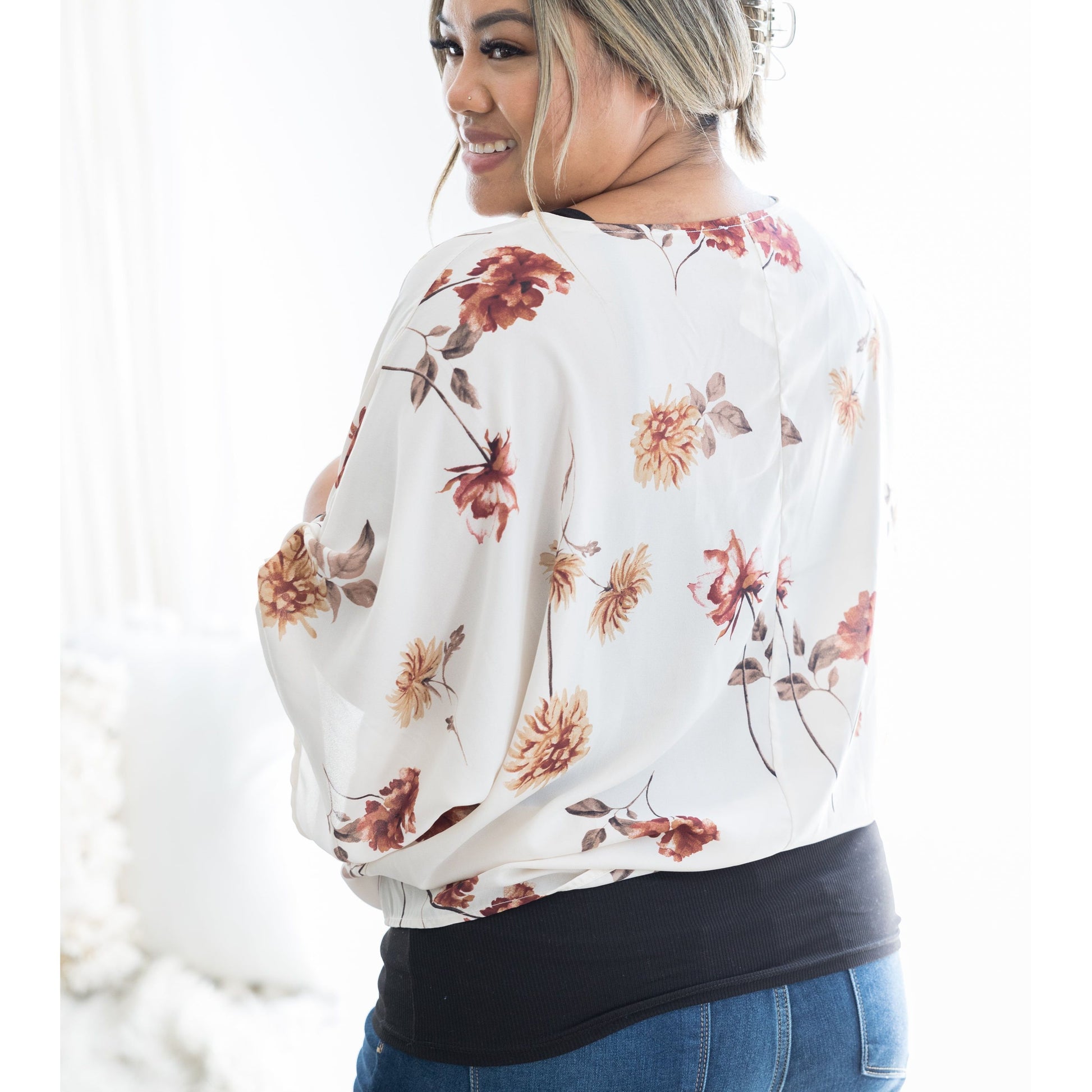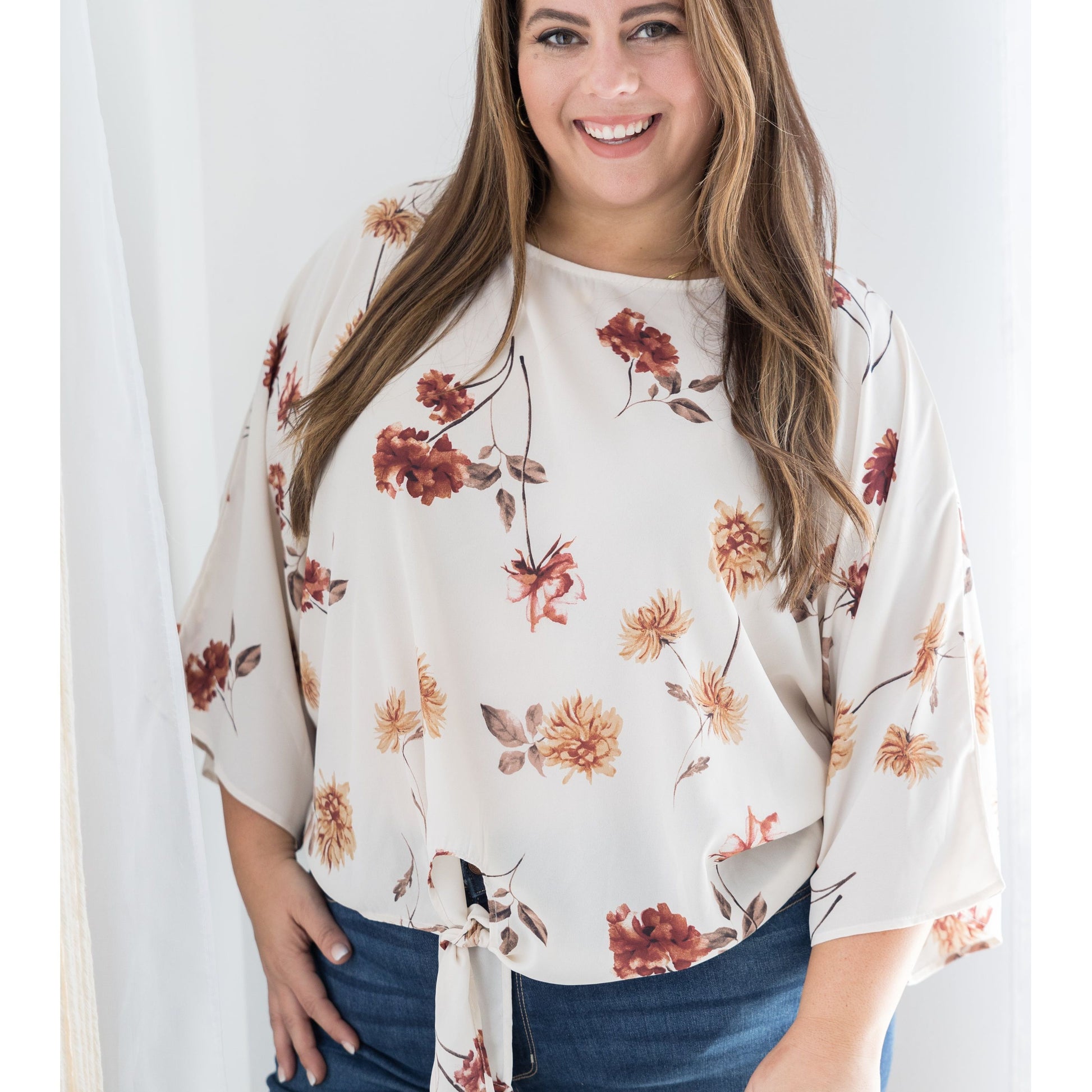 This light weight 3/4 sleeve top is one of our favorite transitional pieces. Made from a light weight fabric, this top features a round neckline and front tie detail.
