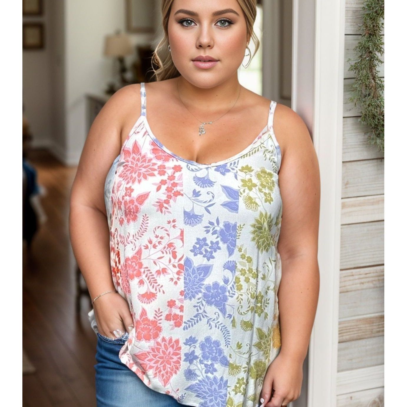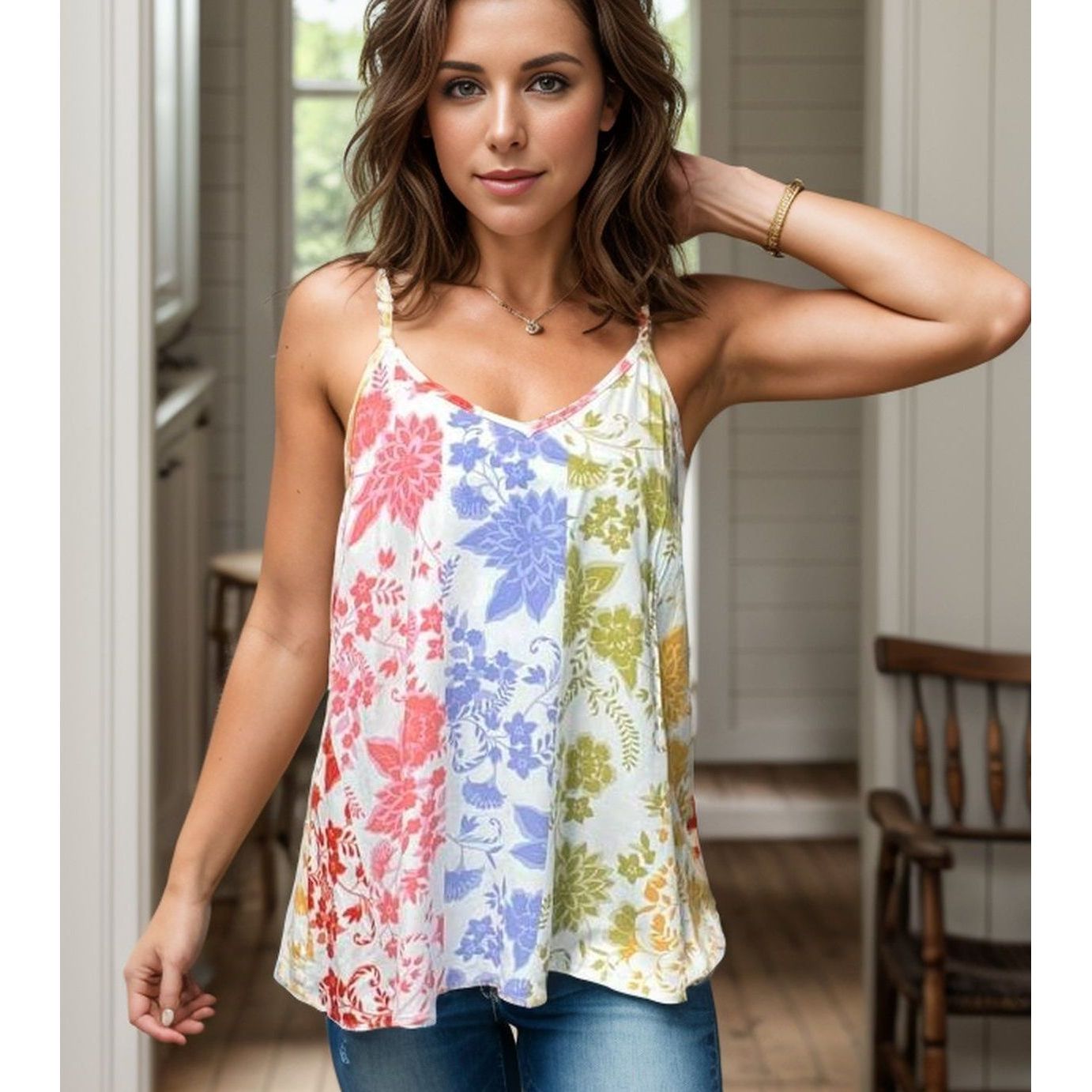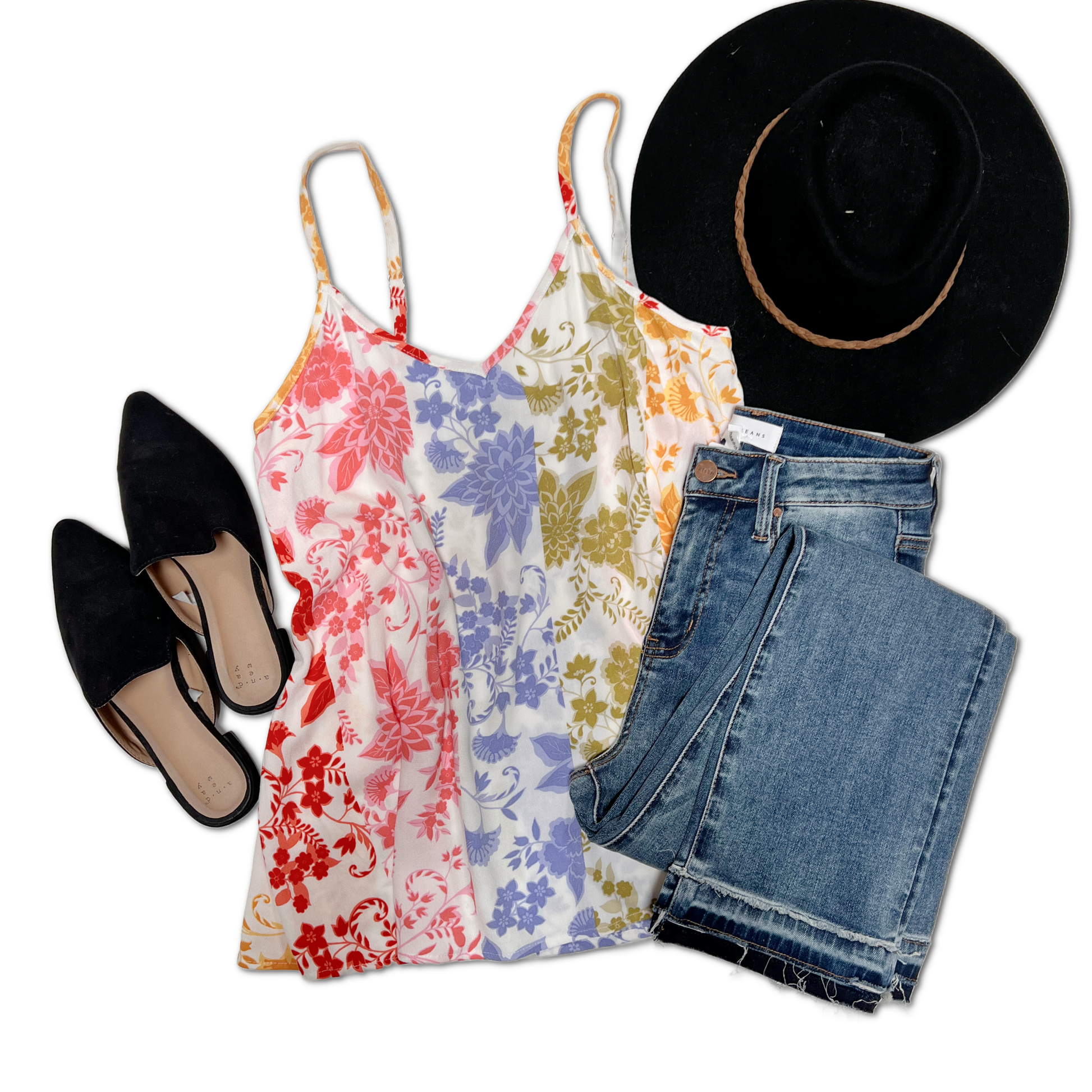 Unleash your soul's desire with our floral print tank! Its adjustable spaghetti straps and relaxed fit offer a comfortable and customizable fit, while the v-neck adds a touch of style. Perfect for adding a pop of color to your wardrobe. (No more boring tanks for you!)