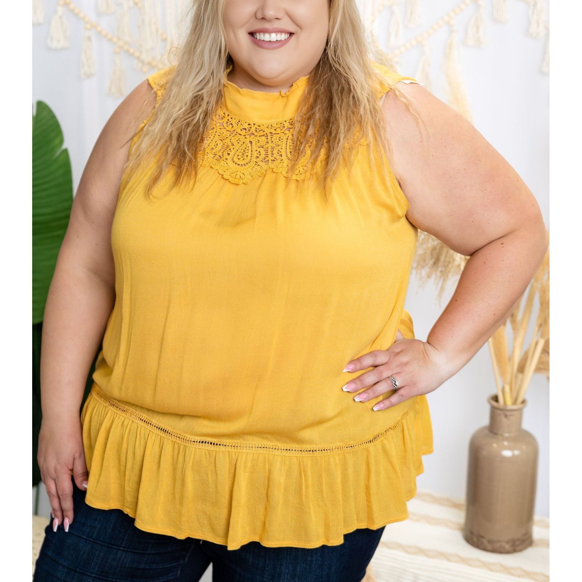 This sleeveless tunic top is perfect for summer days in the city. The beautiful lace trim and ruffled hem ensure a stylish look, while the keyhole detail adds a touch of elegance. The lightweight cotton blend makes it comfortable to wear in any climate.