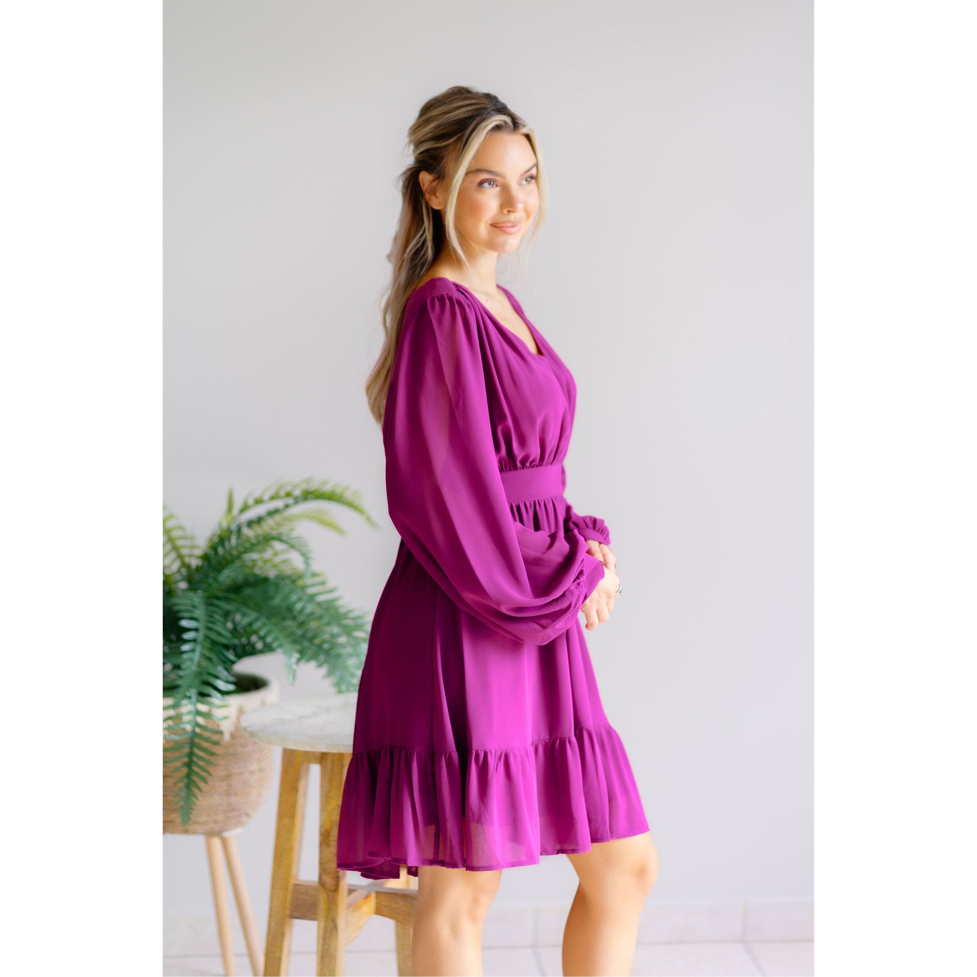 Elevate your style with the Whispered Wishes Dress, featuring a flattering V-neck and elegant long balloon sleeves. The mini length adds a playful touch, while the back tie detail at the sides enhances your silhouette. Fully lined for comfort and confidence, this dress effortlessly blends charm and sophistication for any occasion.