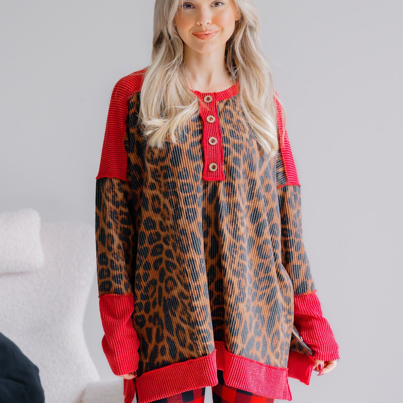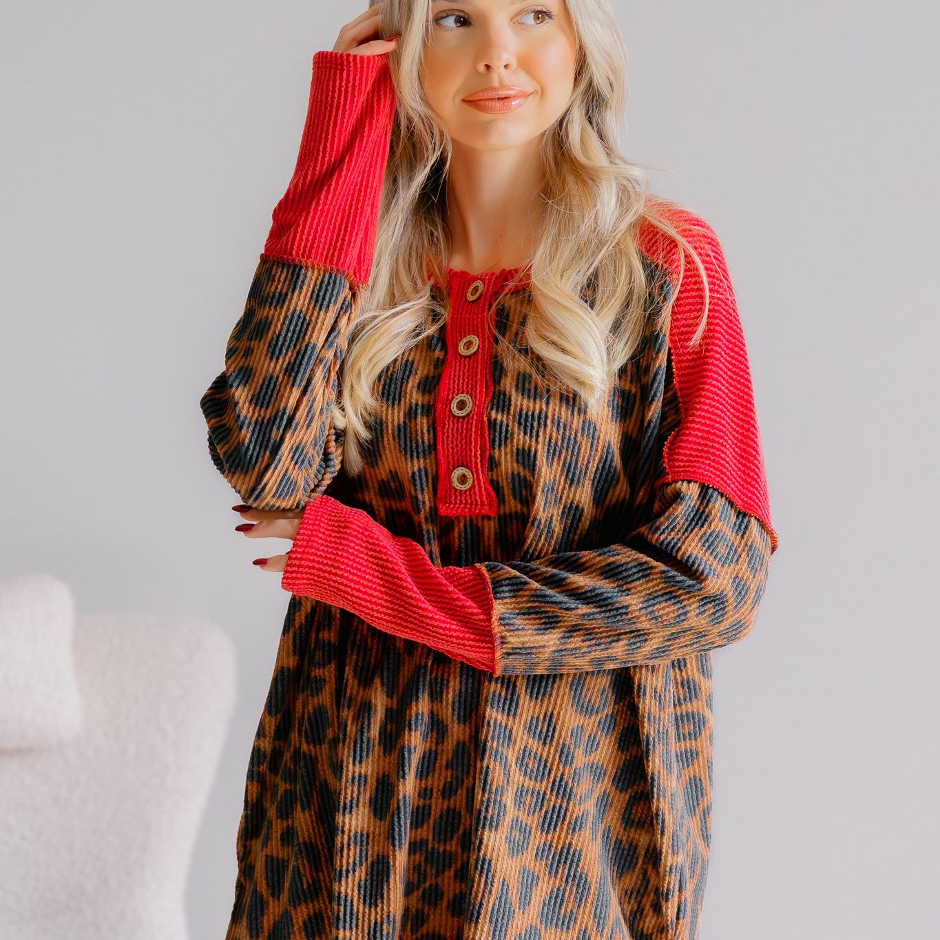 Bring a bold twist to your cozy look with the Wild Sleigh Knit. This playful sweater features a vibrant red and leopard print knit that stands out in any crowd. The half-button-up design adds a fun, flirty touch while making it easy to layer or wear on its own. Perfect for mixing comfort with eye-catching style.